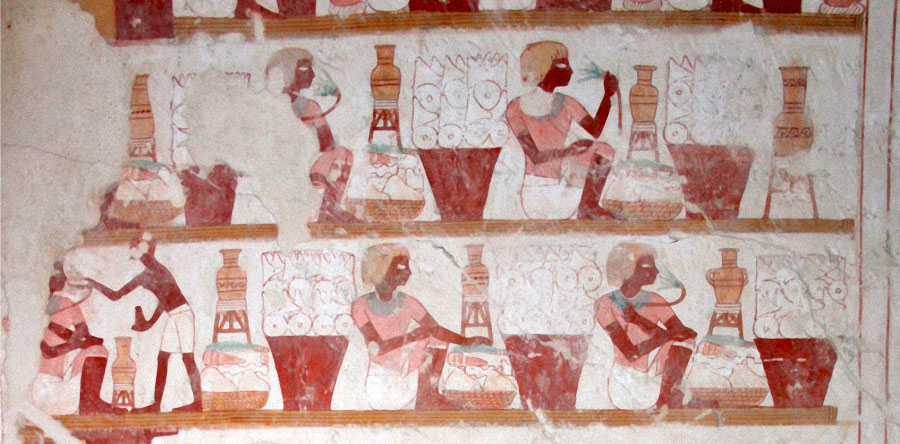 Due uomini portano piccoli vasi con il vino che probabilmente viene travasato in una delle tre file di giare molto più grandi. In alto è inginocchiato uno scriba che prende nota del quantitativo d’uva lavorato, dal quale dovrà essere ricavata un giusta quantità di vino.