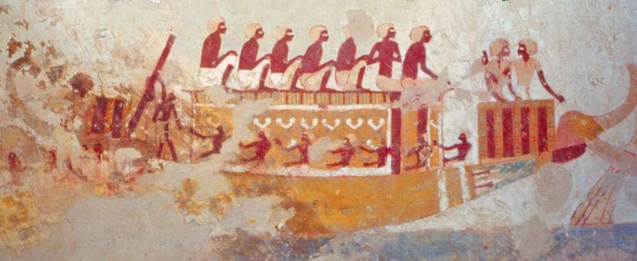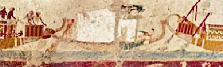 La barca posta dietro quella con il defunto mostra i rematori in azione, il che conferma (oltre all’assenza di una vela) che sta scendendo il Nilo contro corrente da Tebe verso Abydos (18).