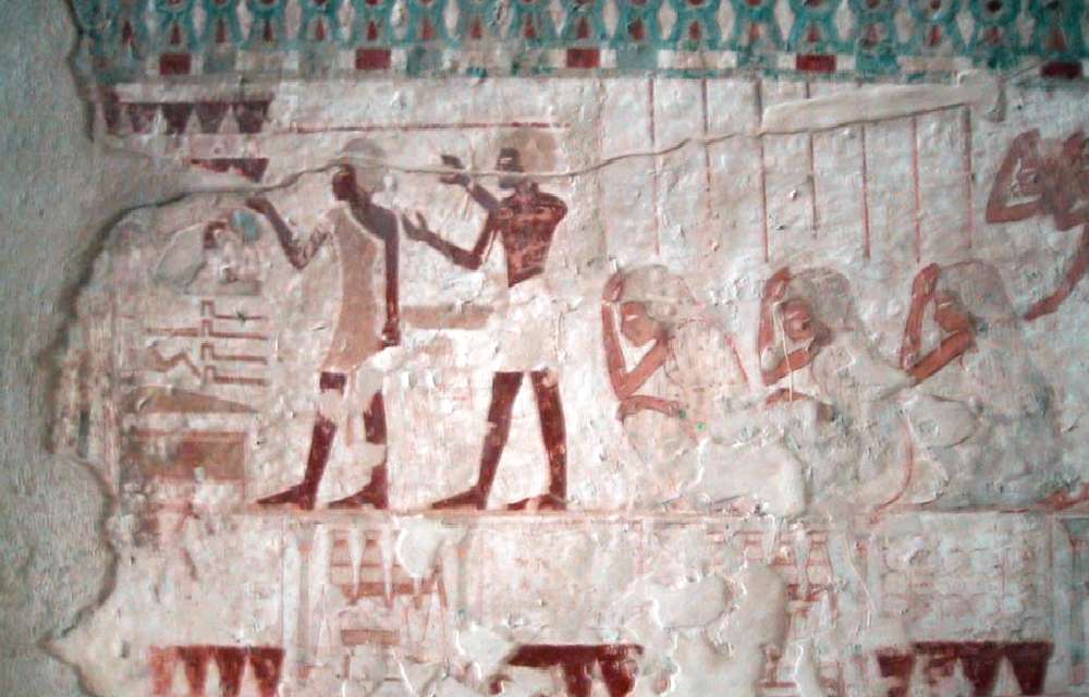 Nel registro sottostante si vedono un gruppo di quattro musicisti, un suonatore di arpa ed un altro gruppo di tre musiciste parzialmente cancellate; la prima suona un flauto doppio mentre le altre due battono il tempo con le mani.
