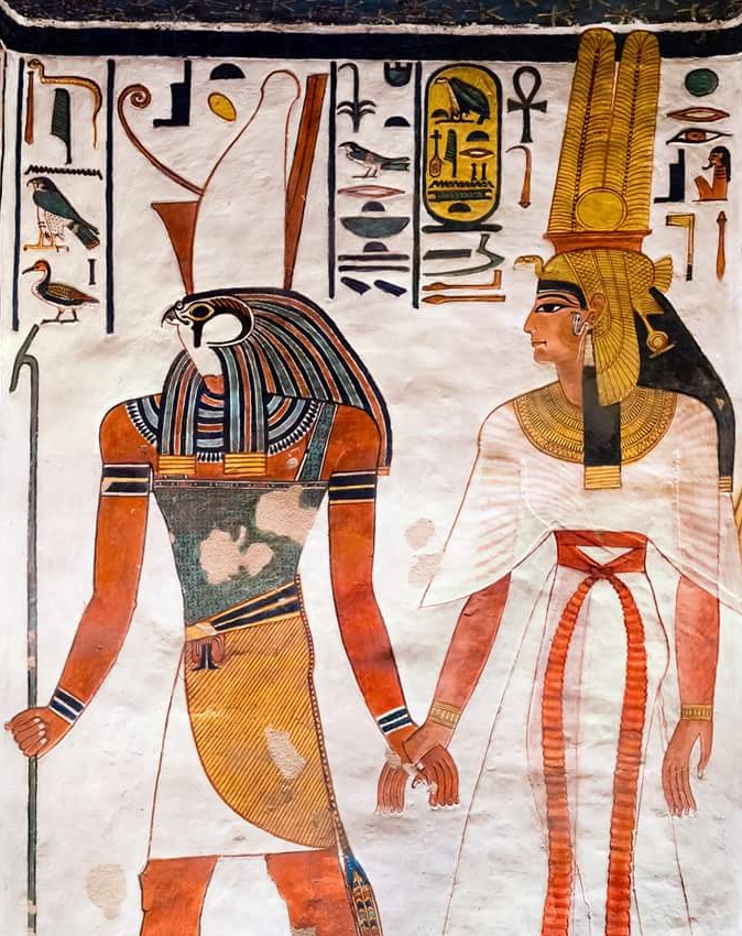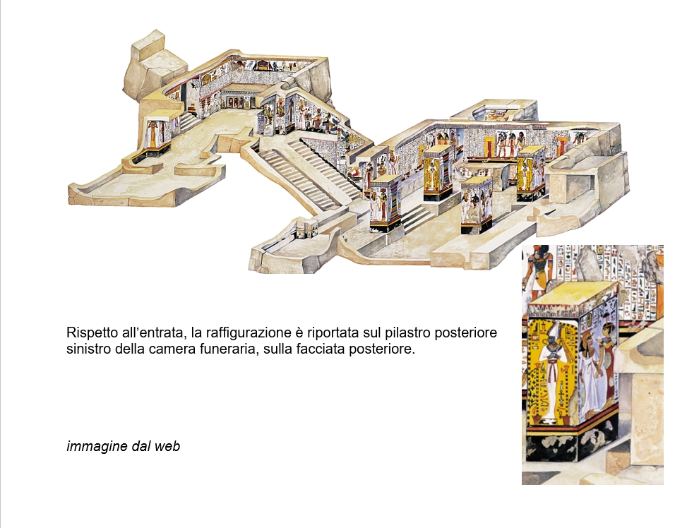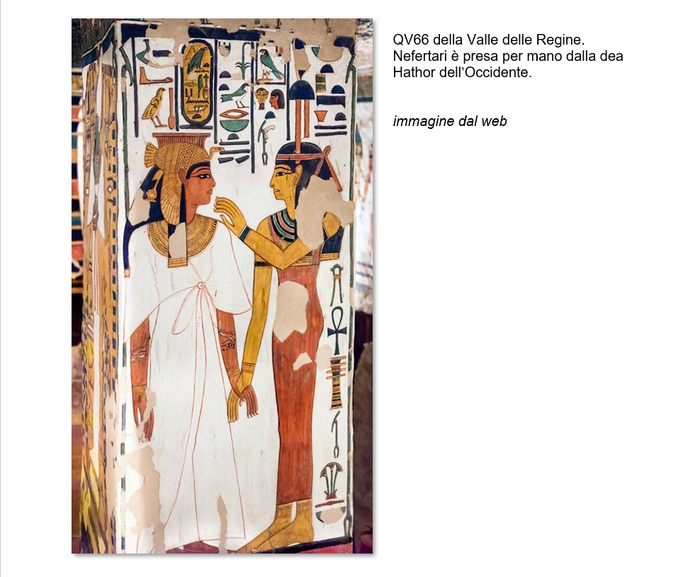 Su una stretta parete si trova la raffigurazione che vi presento. C’è Horus che prende per mano Nefertari e la presenta agli dèi.