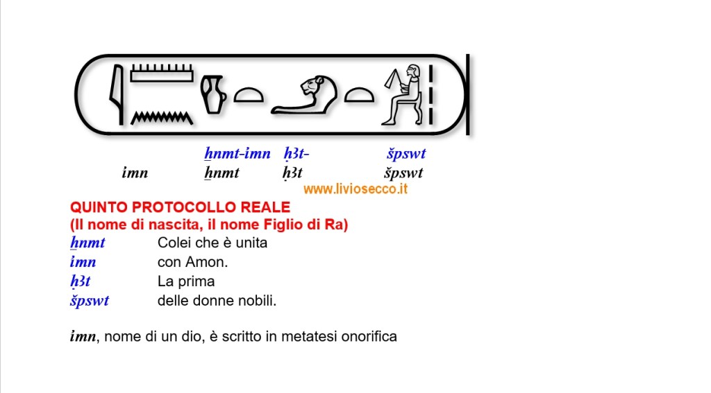Per coloro che volessero approfondire la tematica consiglio la lettura del Quaderno di Egittologia 22: IL PROTOCOLLO REALE – Composizione dell’onomastica faraonica che potete trovare qui: https://ilmiolibro.kataweb.it/…/il-protocollo-reale/