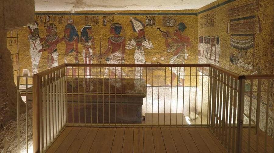 La sensazionale scoperta colpì molto la fantasia popolare, ma gli studiosi hanno da sempre precisato che tutto il materiale ivi ammassato, a prima vista un tesoro unico, erano insieme di oggetti, sicuramente preziosi, ma provenienti da sepolture di sovrani scomparsi, per allestire velocemente il corredo funerario del giovane re. Infatti solo la camera sepolcrale è decorata da pitture, che sono giunte a noi quasi intatte. Le pareti sono rivestite di un intonaco di gesso dipinto di giallo, colore che rappresenta il divino. “La maggior parte delle figure rappresentate ha come base una griglia di venti quadrati, come si usava in epoca amarniana, anziché 18 in uso nei periodi precedenti e successivi.”