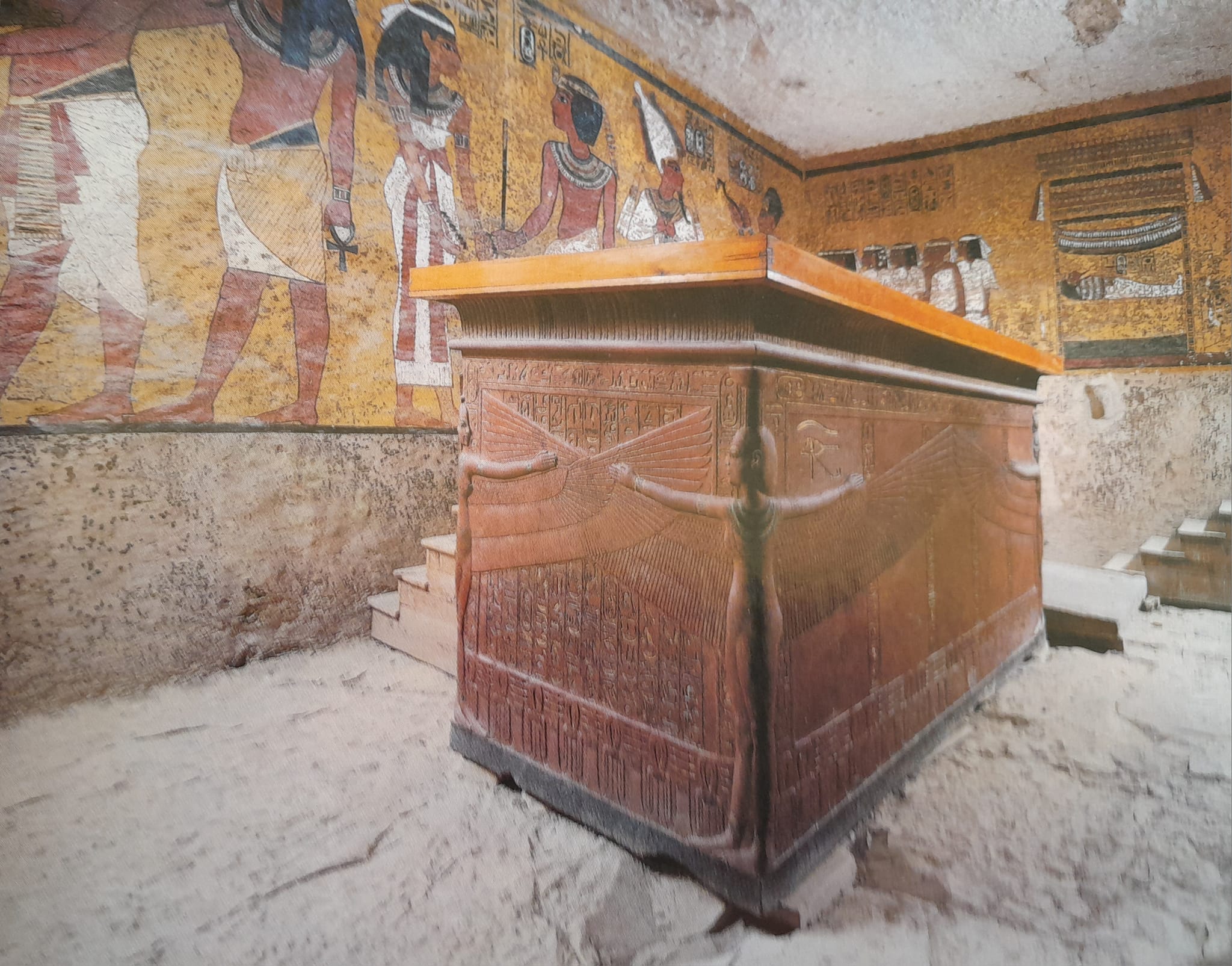 La tomba di Tutankhamon, la cui scoperta nel 1922 da parte di Howard Carter, suscitò grande entusiasmo per l’eccezionalità dei tesori trovati, è, rispetto ad altre tombe reali, molto piccola. “Sia la modesta estensione del monumento funerario sia l’evidente rapidità con cui sono state eseguite le decorazioni, testimoniano della prematura morte (aveva 18 anni) di questo faraone salito al trono a nove anni succedendo ad Amenofi IV.”