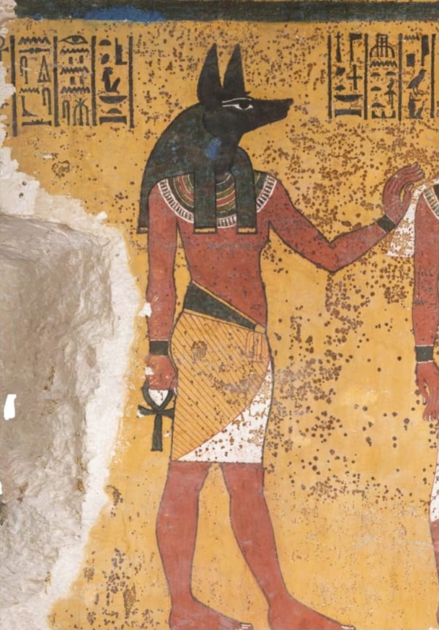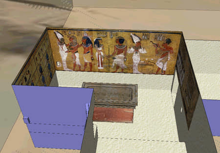 Le pareti della camera funeraria di Tutankhamon erano dipinte con raffigurazioni che ci sono pervenute quasi intatte. Purtroppo la porta che dava accesso alla camera sepolcrale era posizionata nella parete sud ed è quella che ha subito gravi danni a causa delle inevitabili opere di smantellamento necessarie per consentire il passaggio degli ingombranti scrigni in legno dorato ed i preziosi sarcofagi. L’equipe di Howard Carter riuscì comunque a recuperare la maggior parte dei frammenti, così da poter ricostruire la scena . Oggi, grazie a ripetuti lavori di restauro è possibile osservare il re con il copricapo Khat, che riceve la vita, sotto forma di ankh, da Hathor, signora dell’Occidente, in presenza di Anubi, divinità dell’oltretomba e della mummificazione.