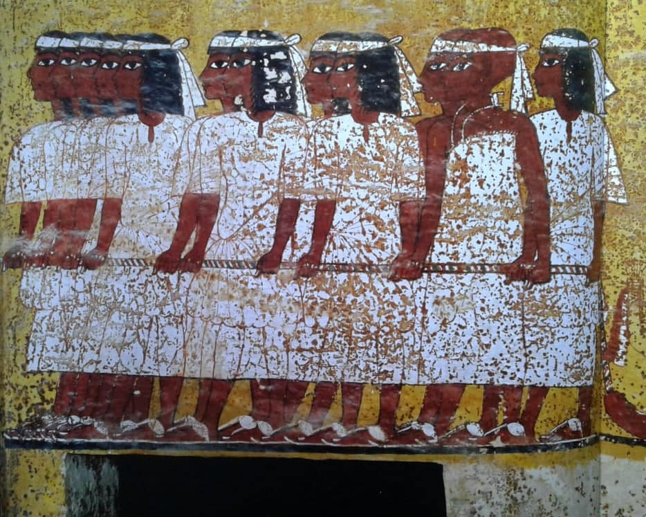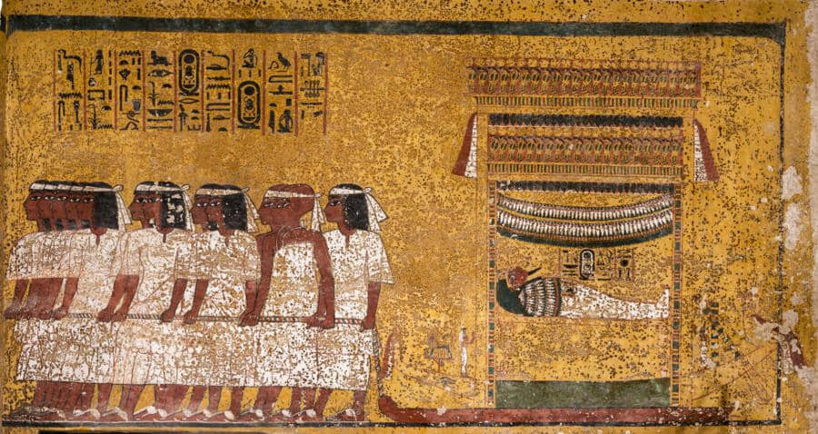 La mummia reale, il cui nome è scritto sopra in geroglifici, è distesa su un catafalco riccamente decorato con festoni di fiori e trainato da un gruppo di dodici alti dignitari di corte con in capo la caratteristica benda bianca del lutto. Tra loro, nei due con la testa rasata, si riconoscono i visir dell’Alto e Basso Egitto. Al di sopra un testo geroglifico riporta le parole rituali: ‘Neb-Kheperu-Ra (Tutankhamon), Vieni in pace, o Dio protettore del paese.” Soprattutto durante il nuovo Regno questo tipo di raffigurazioni ricorre spesso nelle tombe dei ricchi, ma non si è mai riscontrato in altre sepolture reali. Da questo punto di vista la tomba di Tutankhamon è un Unicum.