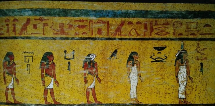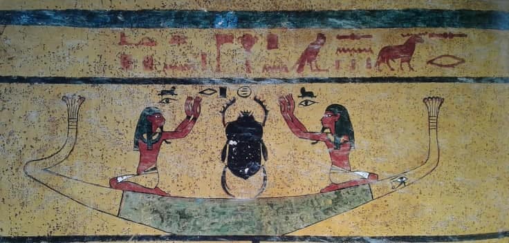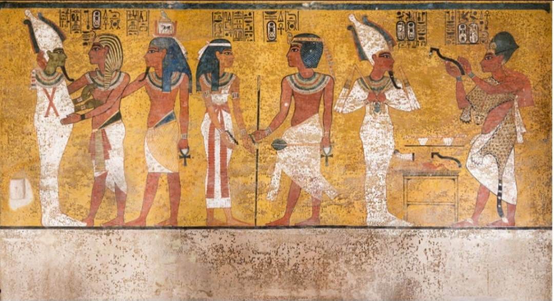 Le pitture murali della tomba di Tutankhamon hanno un significato speciale per il suo viaggio nell’oltretomba; nonostante siano scarne di contenuto e molto semplici nelle esecuzione, assumono un interesse particolare perché formano l’essenza dei concetti che riguardano l’aldilà tipici dell’epoca.