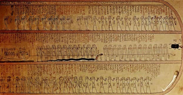 La parte inferiore è suddivisa in sezioni che rappresentano dodici babbuini accovacciati, simbolo delle dodici ore della notte “attraverso le quali il re doveva passare per poter rinascere”