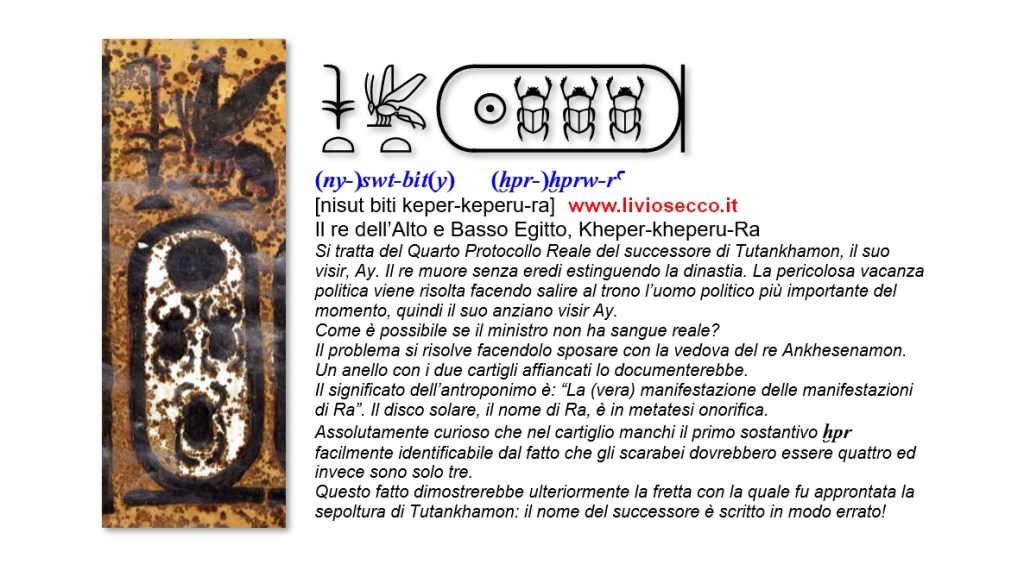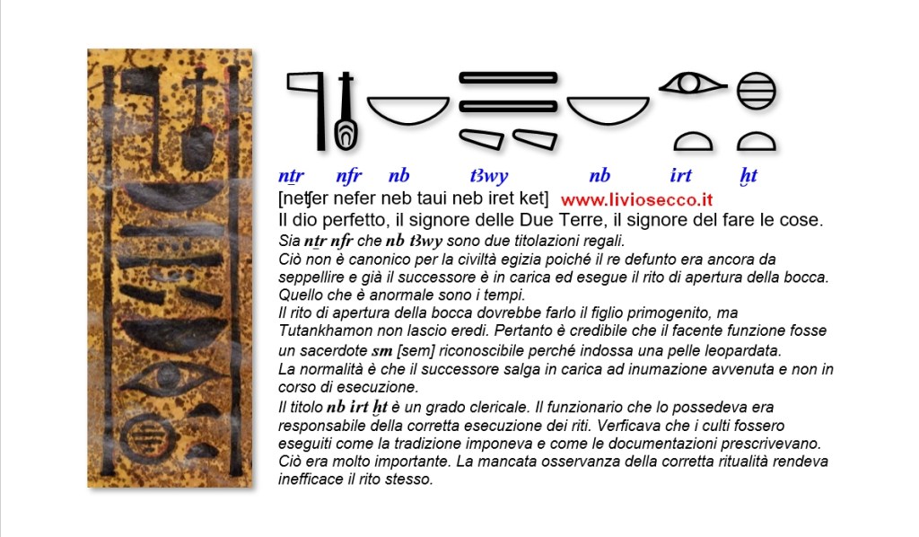 A chi volesse approfondire l’argomento analizzando tutta la traduzione della KV62 non posso che consigliare il Quaderno di Egittologia 35, I GEROGLIFICI DI TUTANKHAMON – Traduzione della KV62 che può trovare qui: https://ilmiolibro.kataweb.it/…/i-geroglifici-di…/