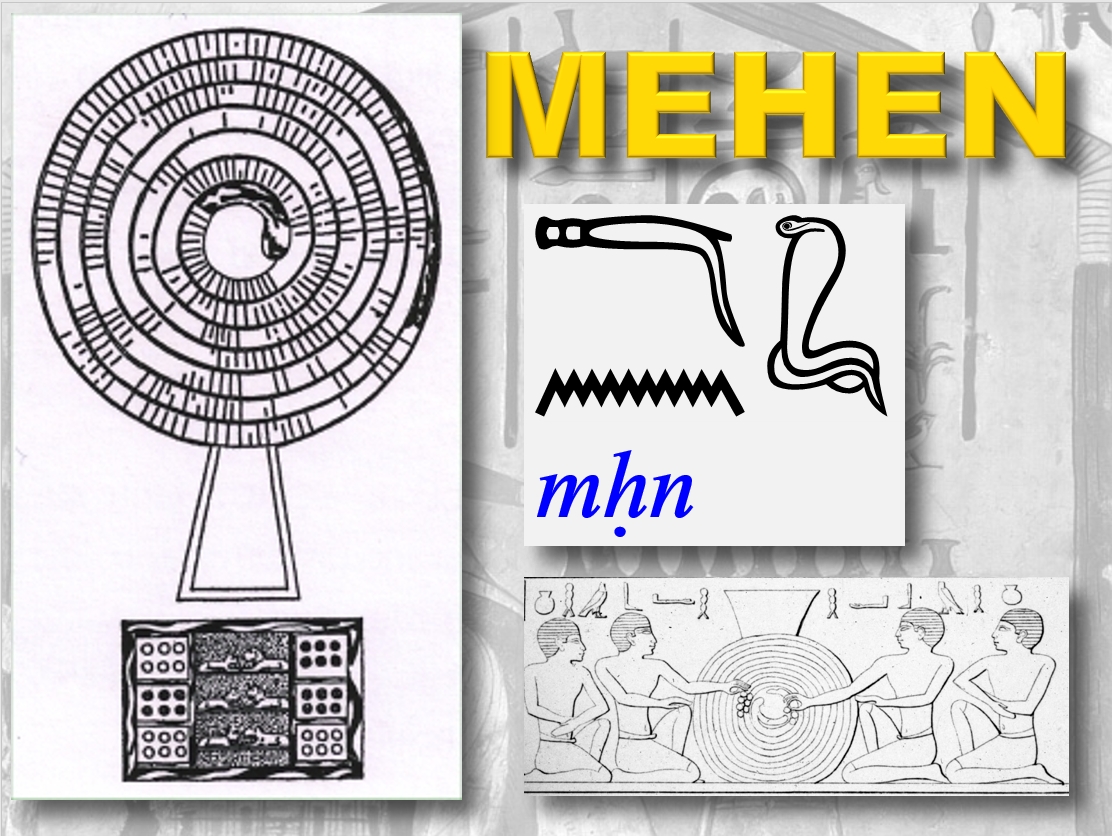 Uno di questi è rappresentato nella tomba di Hesy-Ra (2700 a.C.) dipinto su di un muro: si tratta del Mehen, termine che significa “avvolgere, avvolto”.