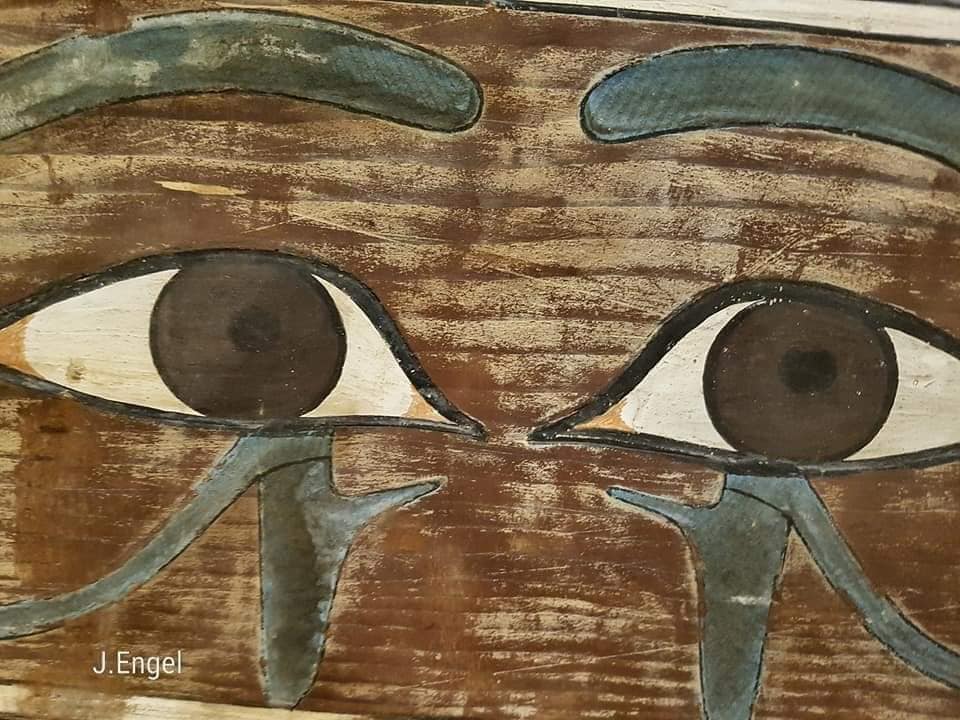 Two Udjat eyes are located at the top of the false door that is depicted on the side, to which the mask of the anthropoid coffin is turned.
