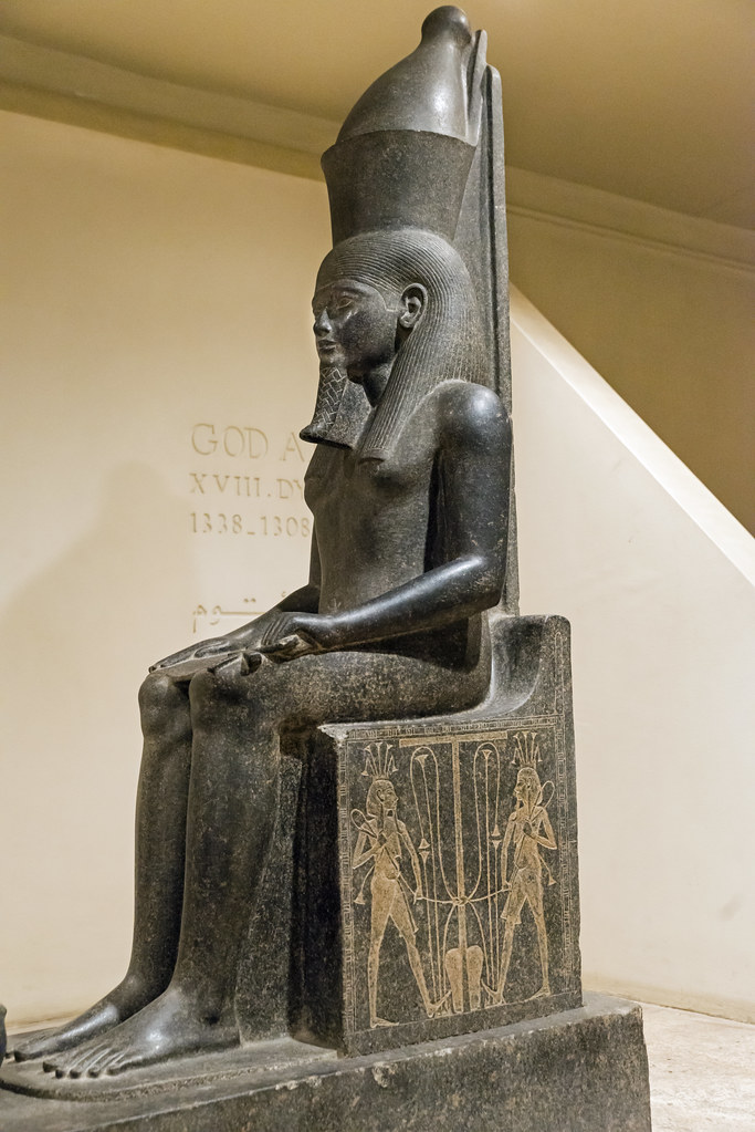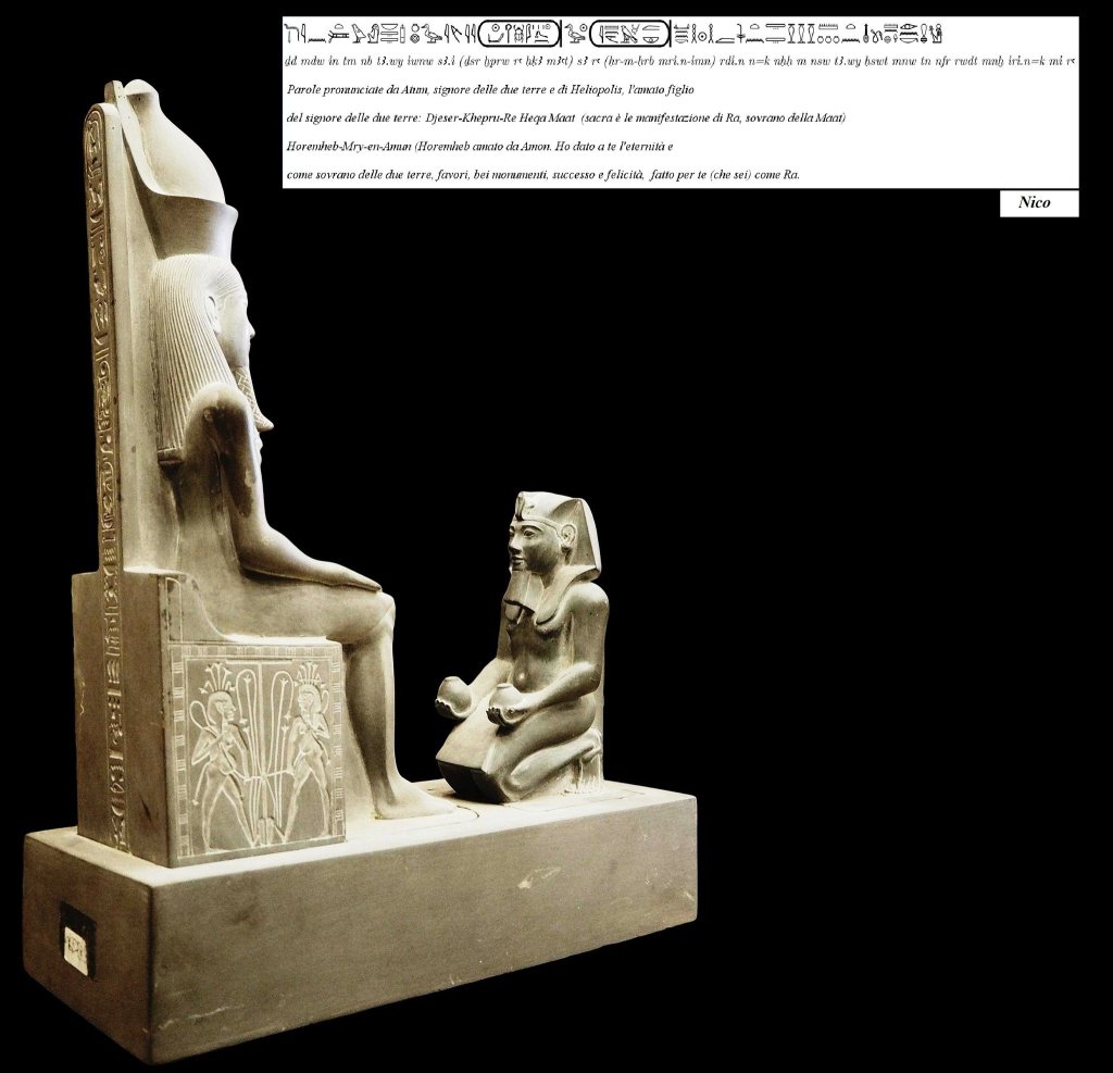 Sul retro di Atum un’iscrizione recita: parole pronunciate da Atum, signore delle due terre: l’amato figlio, signore delle due terre, Djeser-Khepru-Re Horemheb-Mry-en-Amun….