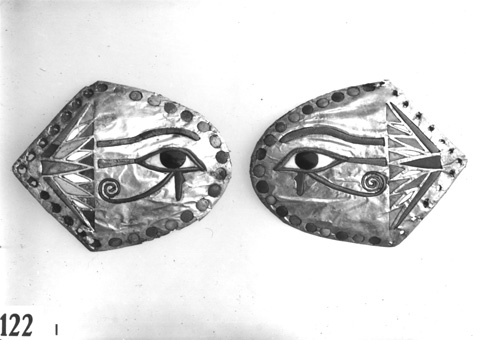 I paraocchi dorati trovati insieme al carro 122, foto di Sandro Vannini (in alto) e foto originale di Burton (in basso)