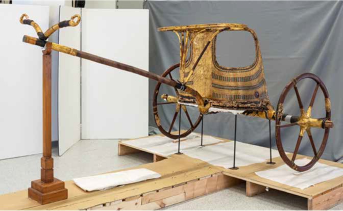 Prima della scoperta della tomba di Tutankhamon, solo altri due carri erano venuti alla luce (insieme al cassone di un carro di Tuthmosis IV praticamente distrutto): uno (ora esposto a Firenze) appartenuto a Kenamun, fratello di Amenhotep II, e l’altro trovato nella tomba di Tuya e Yuya da Davis, ma entrambi ben lontani dalla magnificenza dei carri di Tutankhamon.
