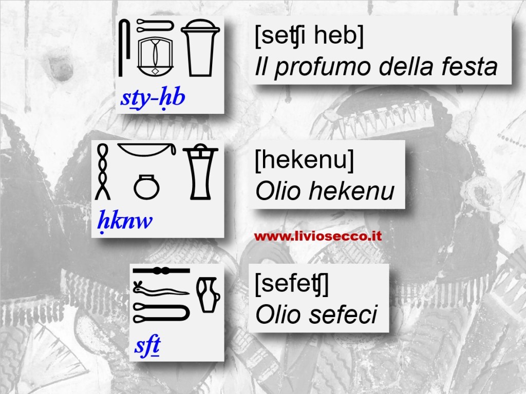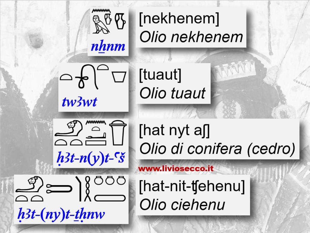 Ancora una curiosità: il sesto e settimo olio sacro (il quinto e il sesto della tavoletta qui presentata) hanno il nome preceduto dal prefisso ḥȜt [hat]. Esso significa “prima, davanti…”. Qui il significato da attribuirgli è “la parte migliore, più qualitativa” del profumo relativo. Ciò che i “nasi” moderni chiamano “la testa” della fragranza.