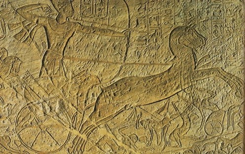 La battaglia di Kadesh. Questo dettaglio rende l’idea della creatività degli artisti che hanno immortalato l’evento nelle sue complesse fasi i molti dei movimenti di Ramses II. Qui è raffigurata una delle scene del Ramesseum , dove la grande battaglia è commemorata sulle facce occidentali di entrambi i piloni ( il primo è il secondo). Questo dettaglio è tratto dal Ramessum, secondo cortile nord, mole nord del secondo pilone, faccia ovest, registro mediano.