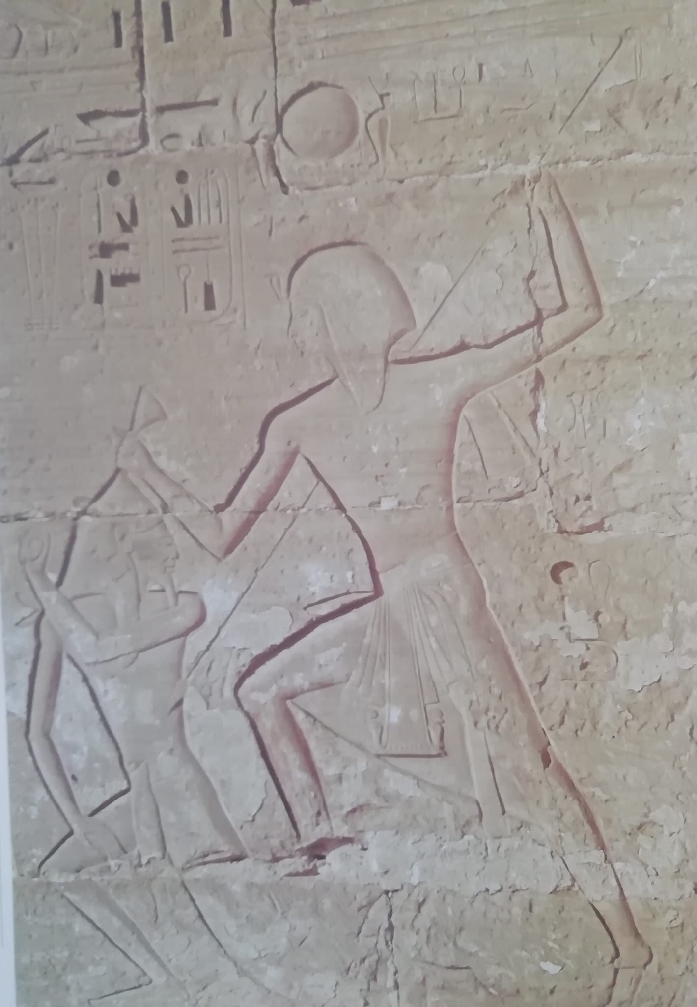 Nella propaganda ramesside non poteva mancare uno dei motivi più antichi dell’iconografia egizia: il faraone trionfante. Le immagini sono solo rituali e assicurano la protezione dell’Egitto. Nella foto il faraone, Ramses II, massacra i nemici.