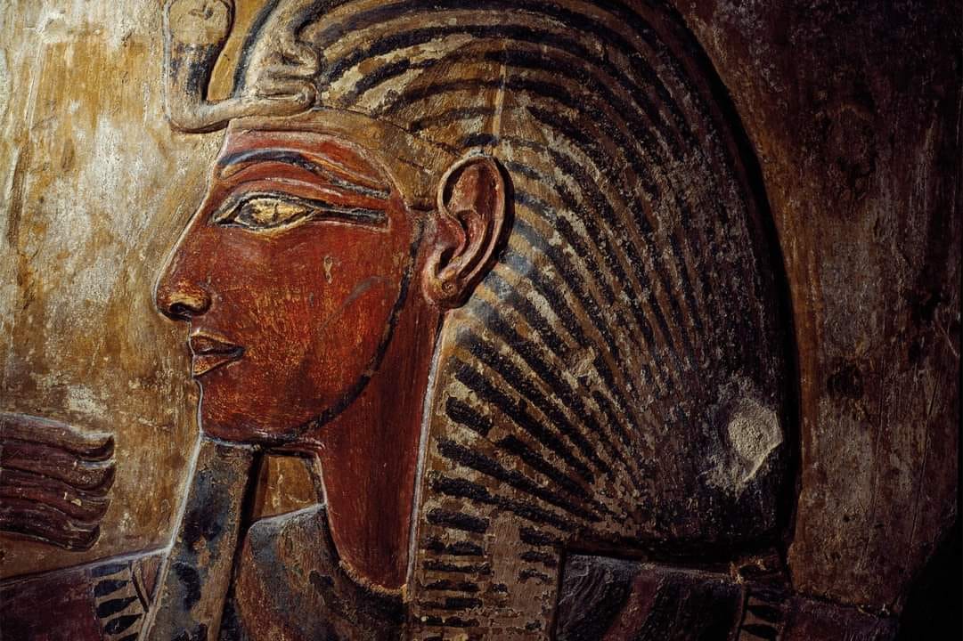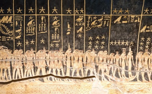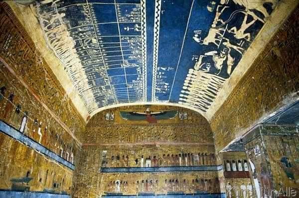 Sotto un soffitto a volta decorato con testo astronomici nella parte occidentale e con la riproduzione delle costellazioni principali, come l’ora Maggiore e Andromeda in quella orientale, si trovava il magnifico sarcofago del faraone..