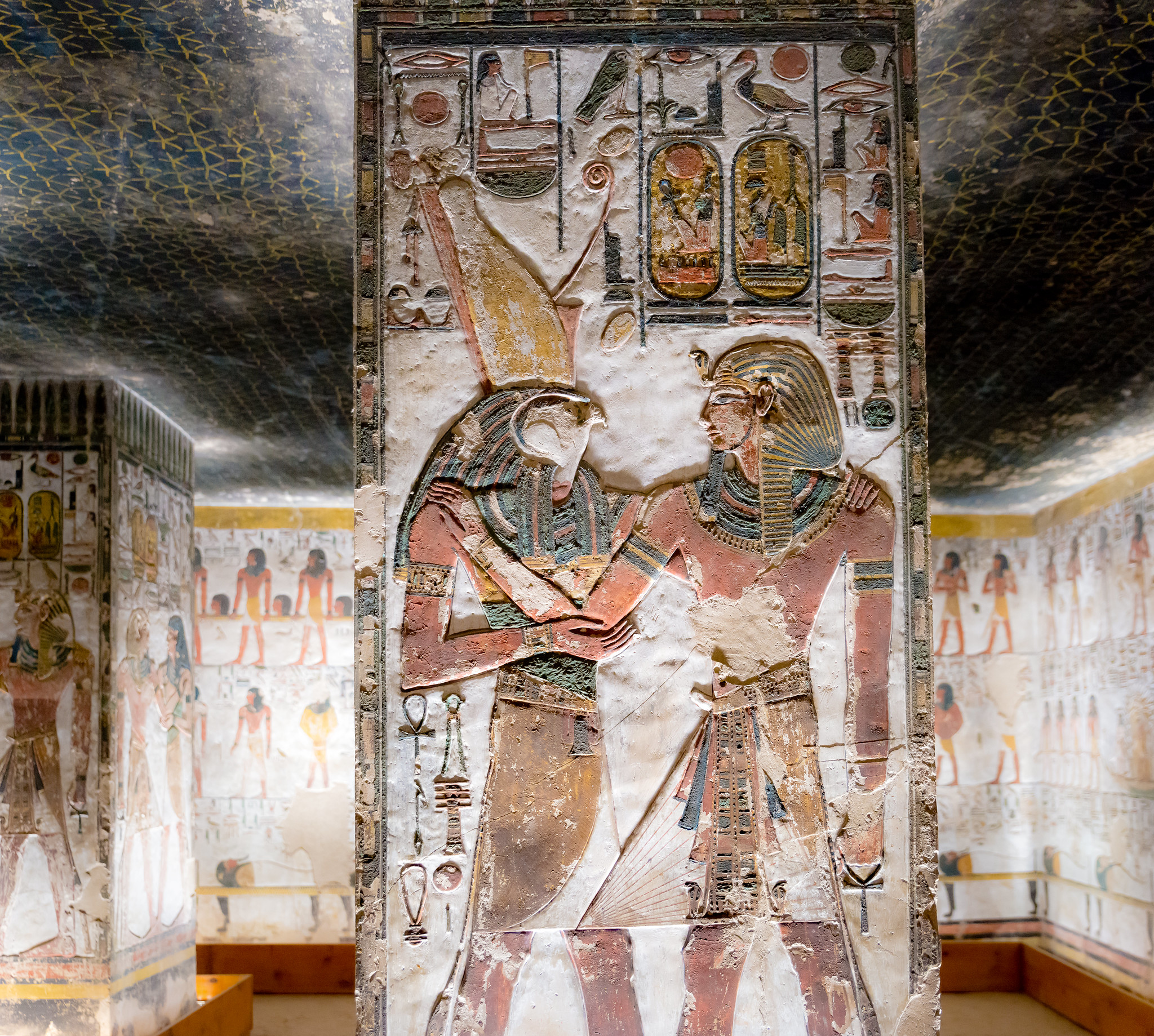 Sui quattro pilastri della sala il faraone è raffigurato in compagnia di diverse divinità.