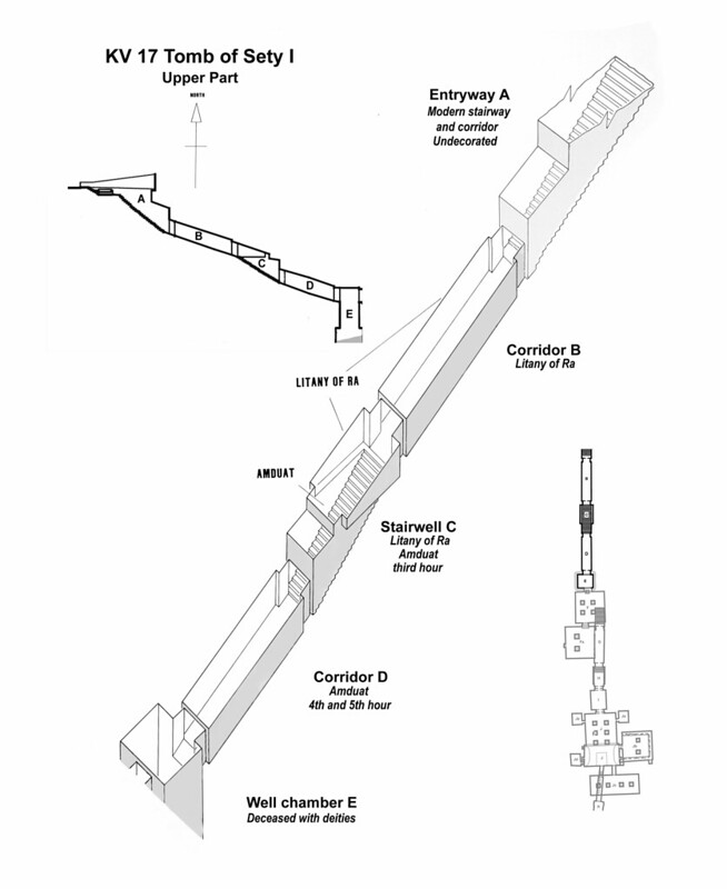 La camera funeraria di Sethy I è decorata con scene dell’Amduat ( le pareti intorno al sarcofago e le due sale che si aprono lateralmente), del Libro delle Porte ( le pareti intorno ai pilastri e la camera laterale che si apre nell’angolo sud-est) e del Libro della Vacca Celeste ( sala laterale che si apre nell’ angolo nord-ovest