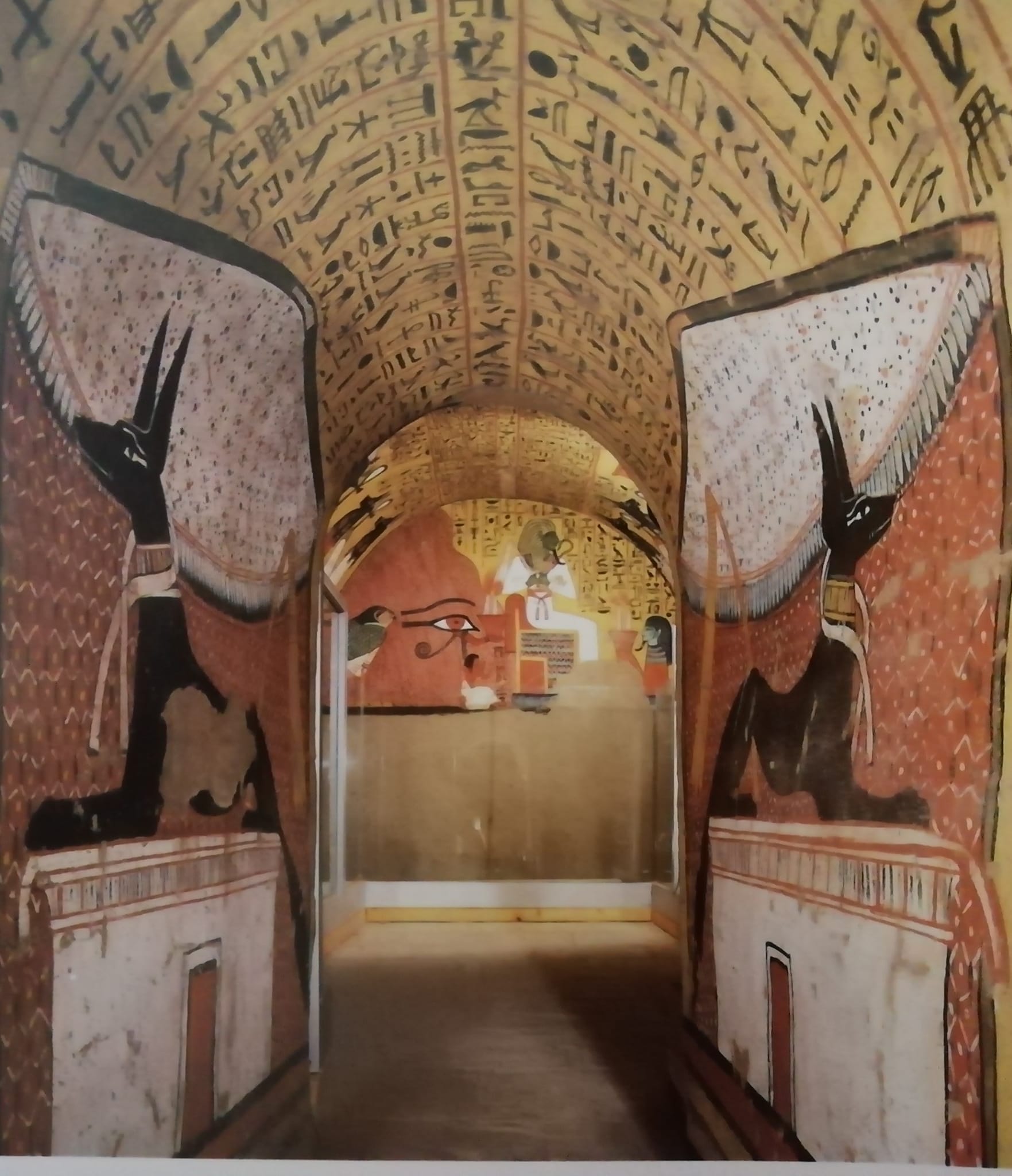 Sui lati dello stretto ingresso a volta sono raffigurati due sciacalli, ipostasi di Anubi, sdraiati su edifici a forma di scrigno, che proteggono l’ingresso della sepoltura. La parete posteriore della camera sepolcrale, esattamente al di sopra del luogo in cui era posto il sarcofago, reca raffigurazioni del capitolo CXXXVII del Libro dei Morti : “Formula per accendere le fiaccole per Osiride, re della necropoli ‘. Le fiaccole devono allontanare le tenebre del mondo sotterraneo e vengono recate a Osiride, assiso in trono di fronte alla catena montuosa occidentale, da un occhio udjat e da una divinità accovacciata.