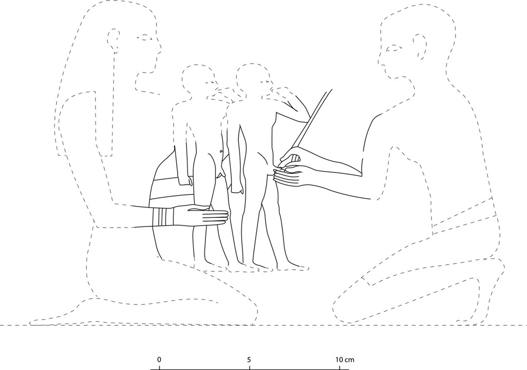 La figura al centro sembrerebbe un “hem-ka”, un sacerdote, e l’azione descritta con le parole incise sopra la sua testa indicherebbero che stia circoncidendo (seb) il suo paziente mentre esorta il suo assistente a tenerlo stretto, mentre una seconda scena a destra sembrerebbe la stessa operazione effettuata su un secondo paziente, anche se le frasi riportate sono molto più controverse. In questa seconda scena, infatti, il “medico” dice “Lo renderò piacevole (comodo, liscio) per te”, mentre il paziente risponde “strofinalo (passalo) bene in modo che possa essere efficace”.