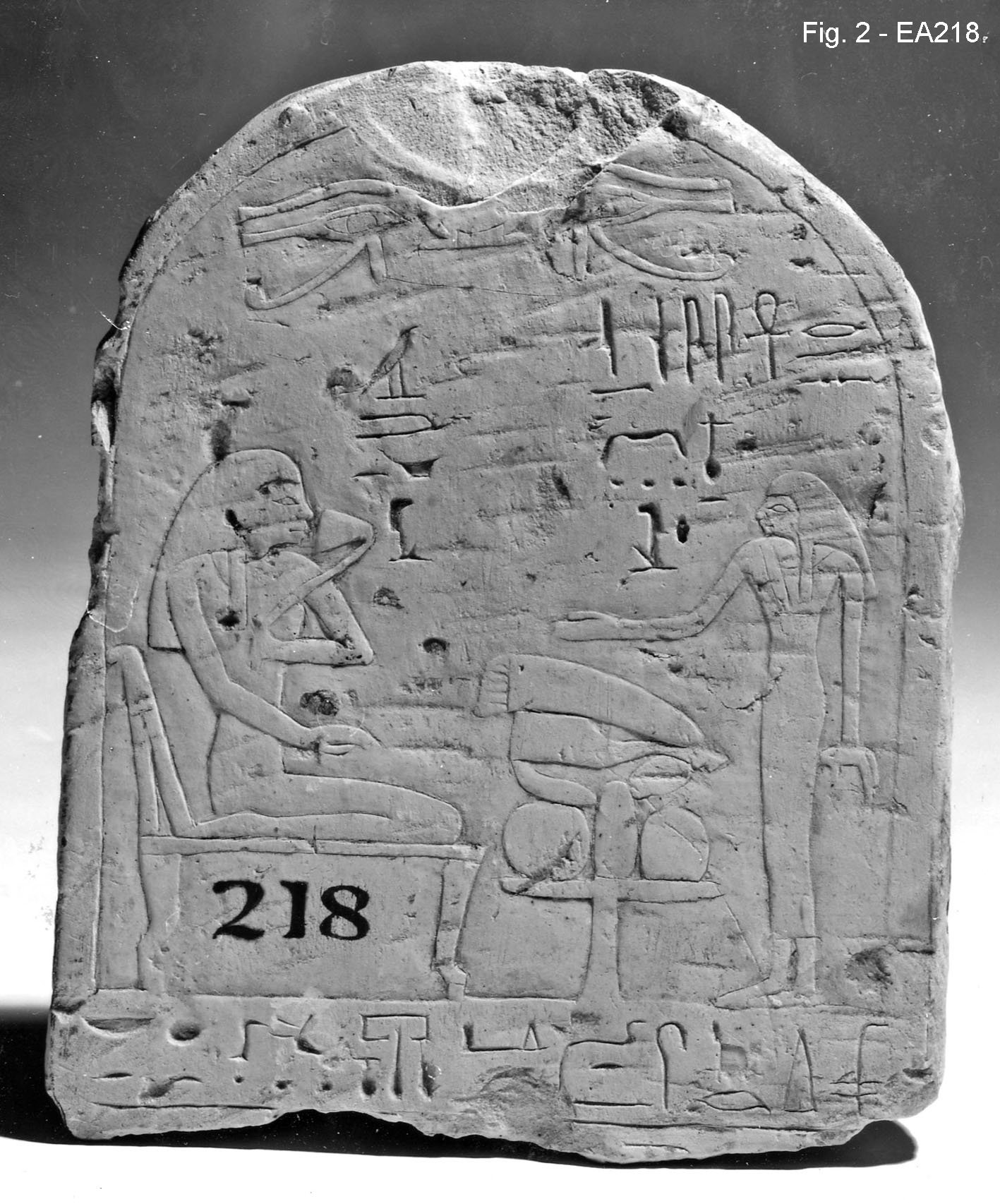 Stele calcarea centinata raffigurante una defunta seduta di fronte ad un tavolo per le offerte e la figura stante di sua sorella; superiormente occhio udjat e testo geroglifico; una riga di testo geroglifico, inferiormente.