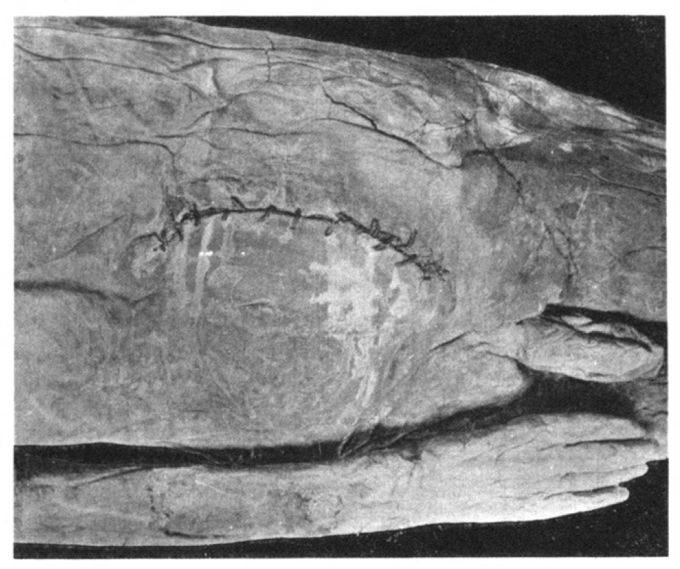 Nonostante la mancanza di evidenza paleopatologica (presente solo sulle mummie, dove ovviamente la ferita per estrarre i visceri non poteva guarire), la descrizione delle suture effettuabili con i materiali di allora ci mostrano che non solo venivano usati aghi e punti di sutura in filo di lino, ma che esistevano anche delle strisce adesive, precursori delle nostre steri-strip e similari.
