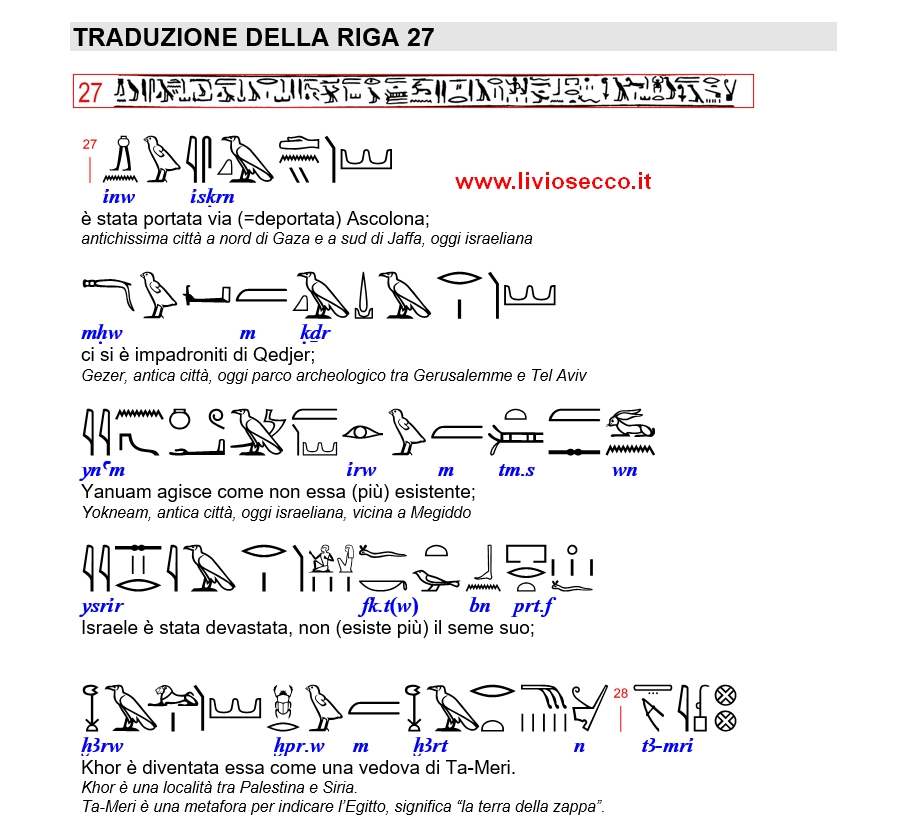 IMMAGINE 4: traduzione di tutto il registro 27. La parte finale della stele elenca tutta una serie di territori che Merenptah ha distrutto durante la sua campagna militare in Asia. I regni stranieri sono accuratamente indentificati singolarmente.
