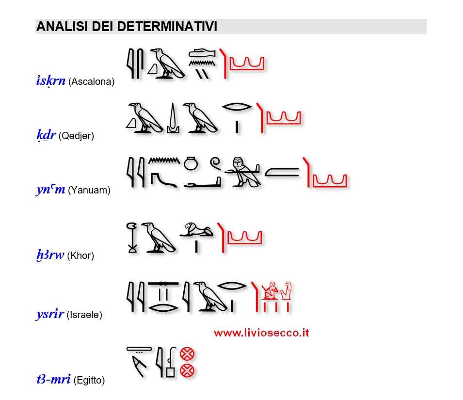IMMAGINE 5: l’analisi dei determinativi è relativa solo al ventisettesimo registro, ma è estensibile a tutta la stele e, più in generale, alla toponomastica egizia.