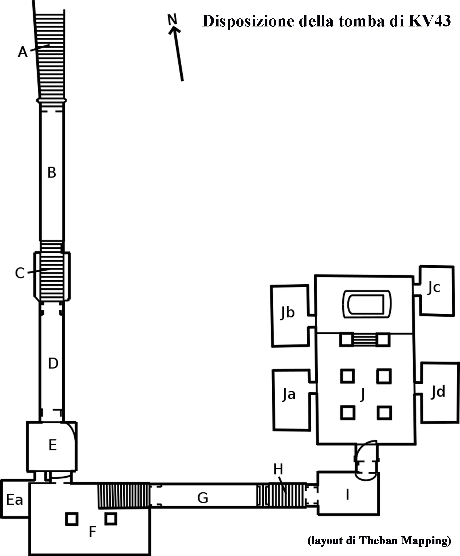 Stranamente le pareti del pozzo sono decorate con scene dove alcune divinità porgono al faraone l’ankh, il segno della vita mentre il soffitto è blu ricoperto di stelle. L’accesso alla camera successiva era murato con decorazioni. Alcuni studiosi pensano che il tutto starebbe ad indicare la volontà di ingannare i profanatori, cosa che però si rivelò priva di effetto. Dall’interno della camera con due pilastri (F) una scala conduce ad un corridoio (G) al termine del quale una seconda scala (H) conduce ad una piccola anticamera (I) e, dopo un breve corridoio, si entra nella camera funeraria (J) sostenuta da sei pilastri. Anche questa è conformata su due livelli, dopo gli ultimi due pilastri una breve scaletta porta al livello inferiore dove si trova il magnifico sarcofago in granito rosso di Thutmose IV.