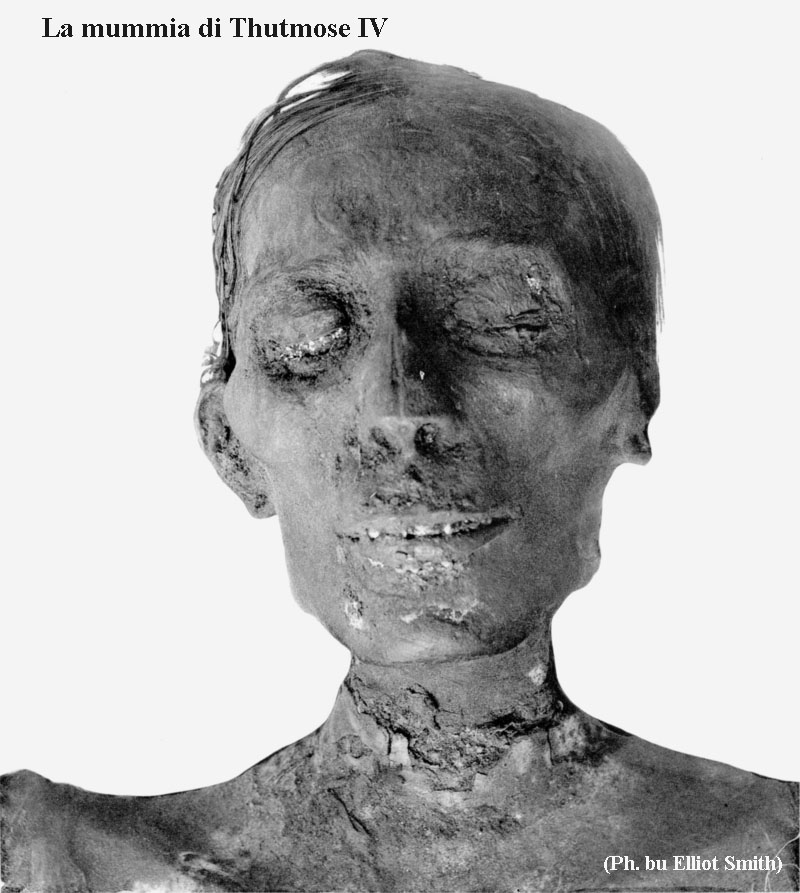 La mummia si presentava con gli avanbracci incrociati sul petto, destro sopra sinistro, portava i capelli di colore bruno scuro lunghi circa 16 cm ed aveva i lobi delle orecchie forati. Elliot Smith rilevò un particolare curioso, la testa di Thutmosi IV si presentava con una leggera connotazione femminile ed una forte somiglianza con Amenhotep II. Recenti studi comparativi, eseguiti da un chirurgo dell’Imperial College di Londra, hanno permesso di stabilire che Thutmose IV, e come lui altri faraoni della XVIII dinastia morti prematuramente, soffrivano con molta probabilità di un tipo di epilessia del lobo temporale in via ereditaria presente nella famiglia reale.
