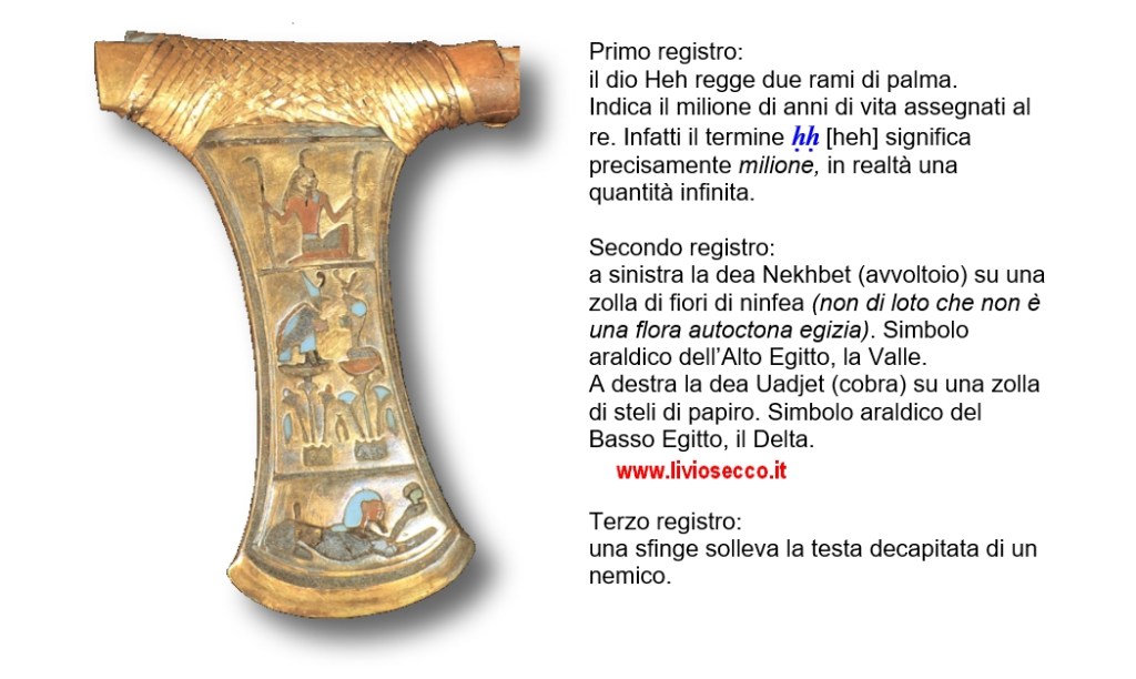 Sulla lama ci sono diverse raffigurazioni che commento in dettaglio con le illustrazioni. Sul secondo registro del lato riconoscibile con il Protocollo Reale c’è la classica raffigurazione del re che giustizia un nemico. E’ molto probabile che si tratti, appunto, di un Hyksos.
