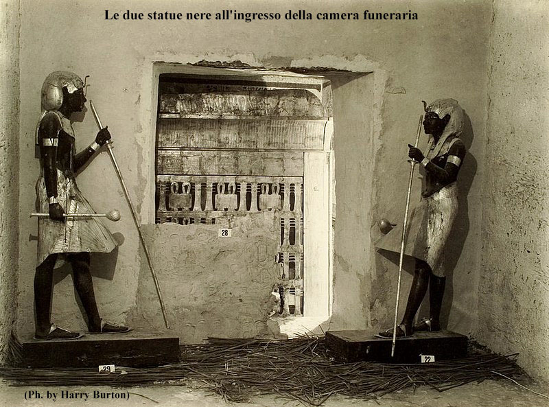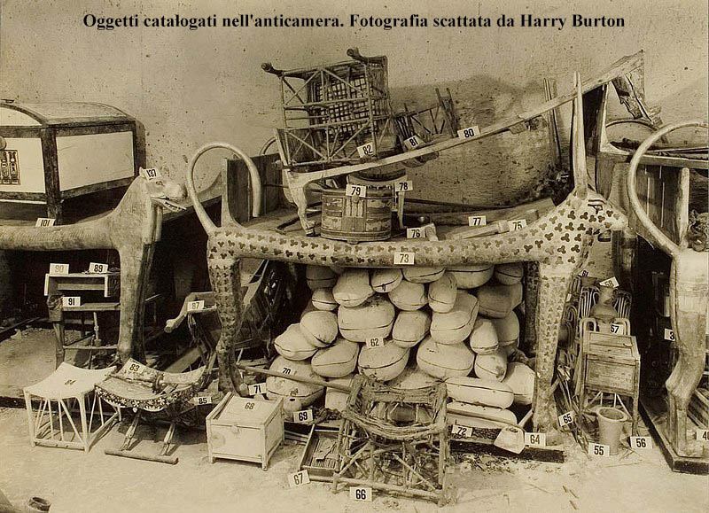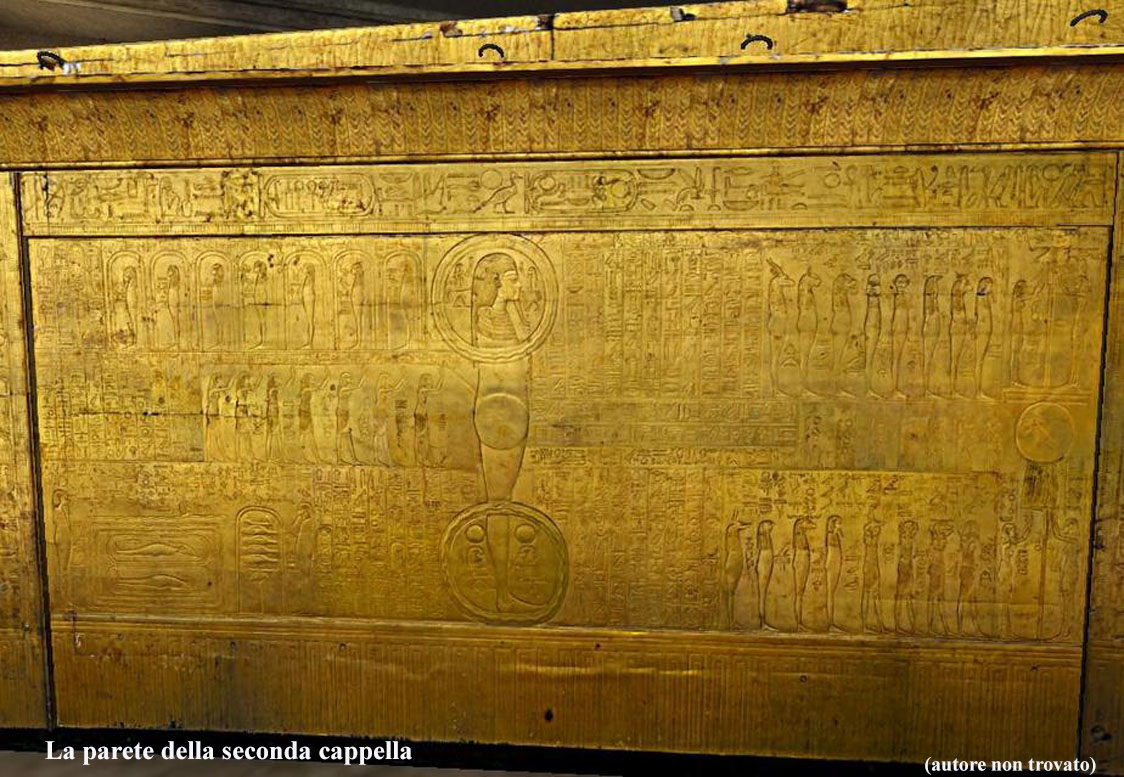 Come sapete quando Carter entrò nella camera funeraria non si imbatté subito nel sarcofago del faraone, questo era racchiuso entro quattro cappelle, o sacrari, in legno dorato che occupavano quasi interamente la camera. La prima cappella era dotata di porte a due battenti ancora chiuse e con i sigilli della necropoli. Ciascuna cappella si presentava decorata e nell’intercapedine tra una e l’altra erano contenuti numerosi oggetti.