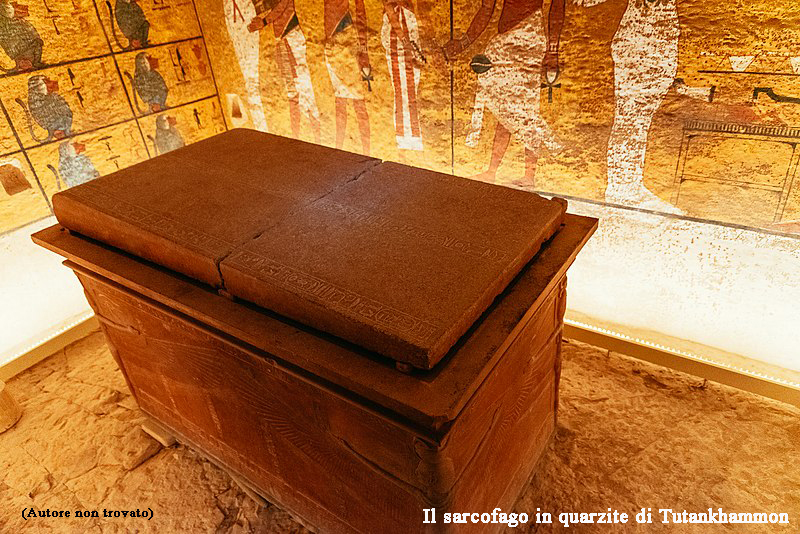 Ovviamente non finisce qui, vediamo ora i sarcofagi che racchiudevano questo giovane faraone. Quello che vide Carter, dopo aver aperto tutte le quattro cappelle di legno dorato, fu un grande sarcofago in quarzite gialla lungo 274 cm, largo 147 cm e alto 147 cm, del peso di oltre 430 kg. Il coperchio si presentava fratturato e riparato con una colata di gesso cui era stato applicato del colore per rendere simile la tonalità all’intera struttura.