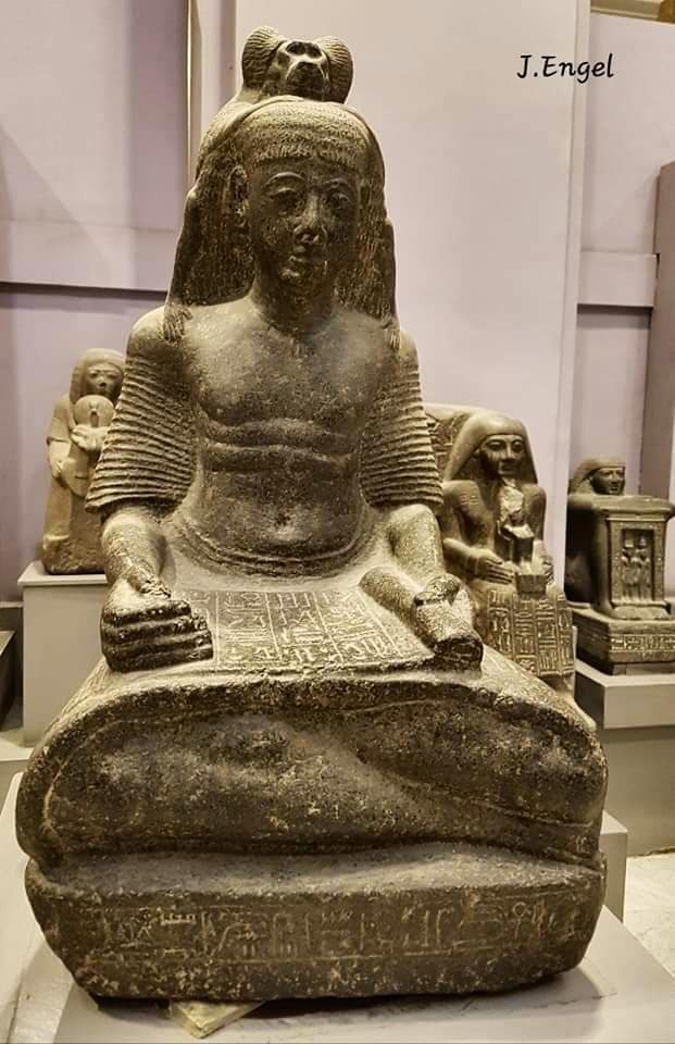 This statue depicts him in the customary pose of a scribe with crossed leg and a roll of papyrus spread over his knees and a cane pen that was once in his right hand, now lost.