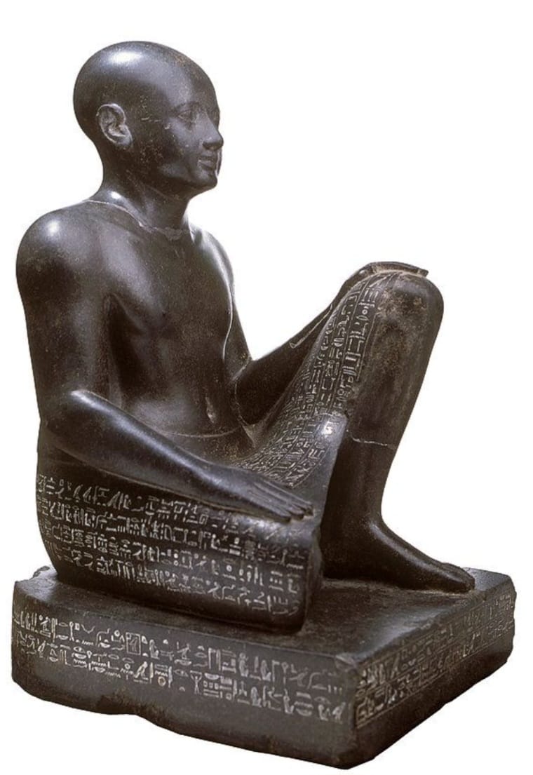 Il contrappunto tra le superfici lisce e iscritte, la testa calva e i tratti idealizzati rispondono invece a canoni artistici del terzo periodo intermedio.