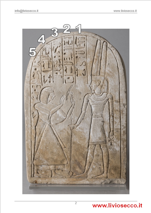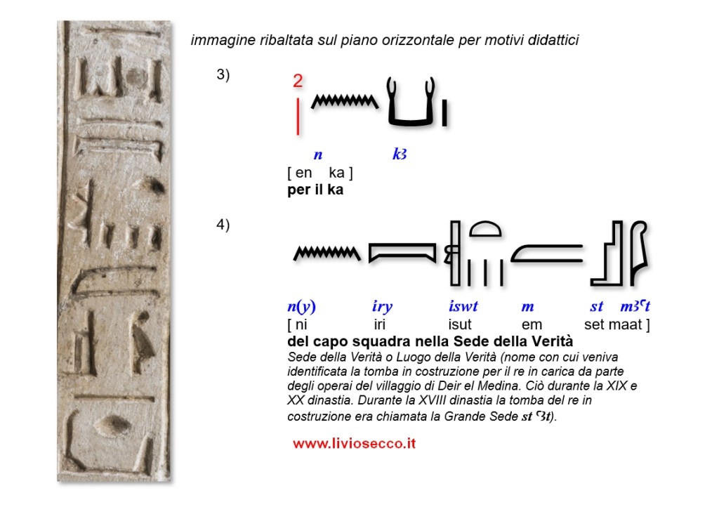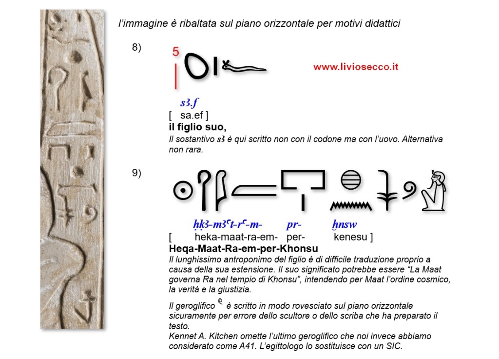 La nostra analisi filologica prevede, come da accordi internazionali, il riporto della grafia su registri verticali in linee orizzontali orientate da sinistra a destra; in ossequio al senso di lettura occidentale. Ciò comporta un diverso posizionamento relativo dei geroglifici.