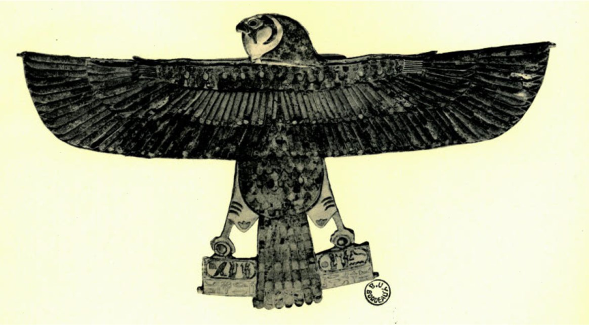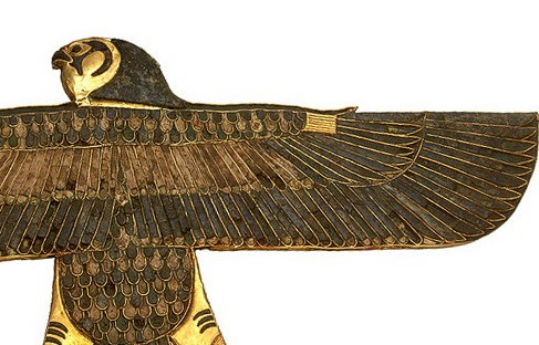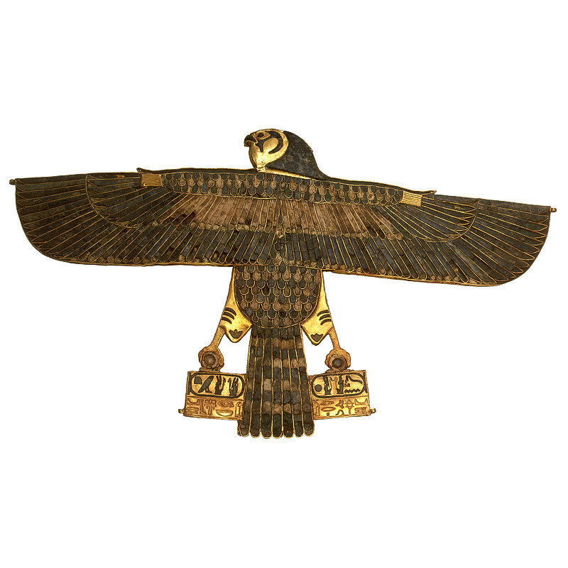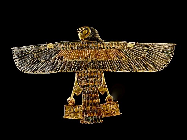 La testa e le zampe sono in oro massiccio, mentre il copro e le ali sono in oro lavorato a cloisonné egiziano. Le ali si sviluppano in larghezza con due file di penne; la pasta vitrea che le compone ha toni che vanno dal blu al verde scuro, dal rosso al giallo-arancio in un’alternanza pregevolmente eseguita a richiamare la brillantezza del piumaggio del rapace.