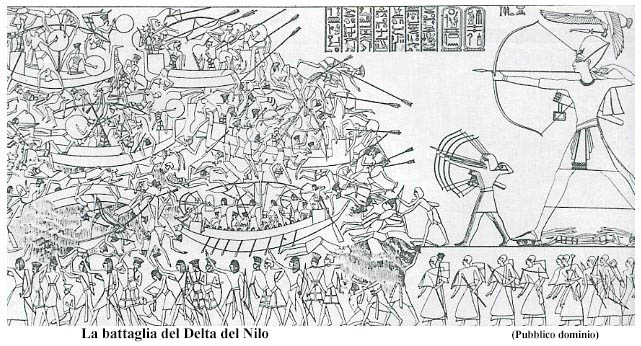 Ancorché meno esperti come uomini di mare, l’astuzia di Ramses III emerse in tutta la sua grandezza, schierò grandi formazioni di arcieri lungo le coste col risultato di tenere lontane le navi nemiche che vennero a trovarsi sotto una grandinata di frecce che impedivano l’approdo, quindi le navi egizie attaccarono le altre navi agganciandole con ramponi per trascinarle via. Infine nel combattimento corpo a corpo i guerrieri egiziani sbaragliarono i nemici. La battaglia è raccontata dallo stesso Ramses III che la fece incidere sulle pareti del suo grande tempio di Medinet Habu:
