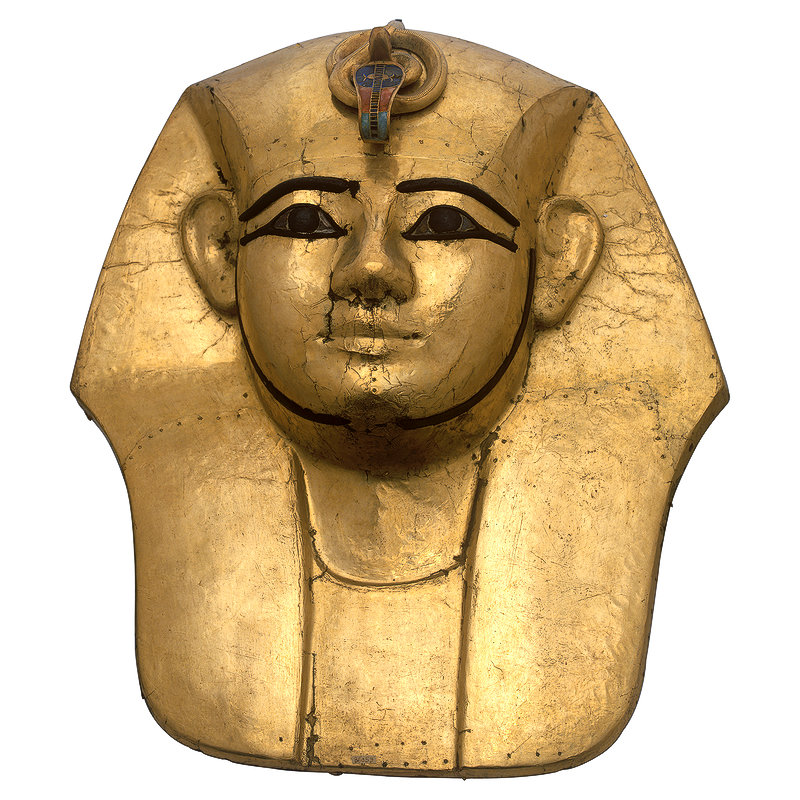 Il volto del Faraone è ritratto da giovane, con le guance piene ed un’espressione delicata. Il re indossa il nemes, che ha la particolarità di essere liscio, essendo totalmente assenti le solite strisce. Sulla fronte del Faraone un ureo in oro massiccio, simbolo di regalità e di protezione, ha il corpo intarsiato con corniola, lapislazzuli e pasta vitrea; sono gli unici elementi colorati della maschera.