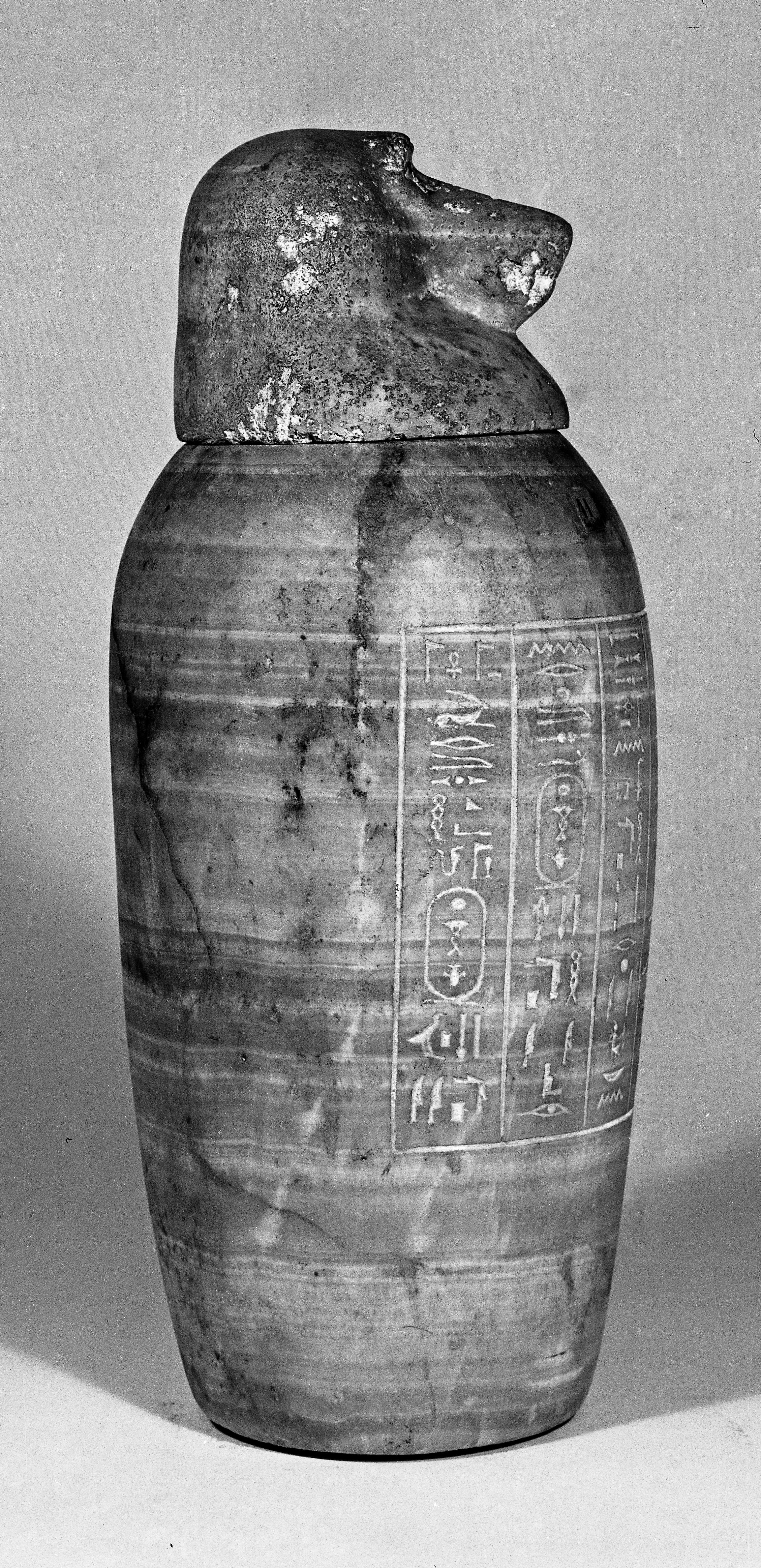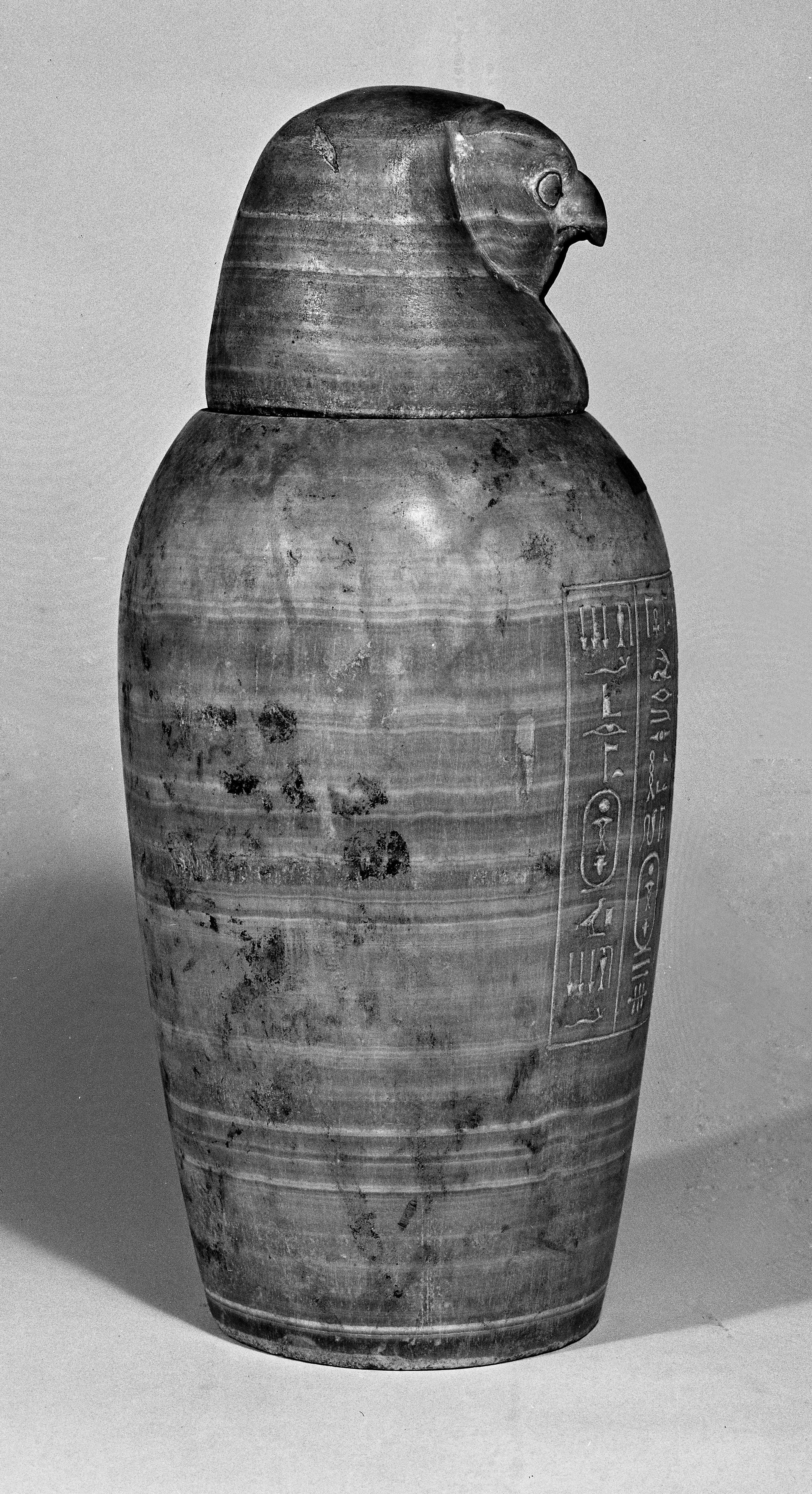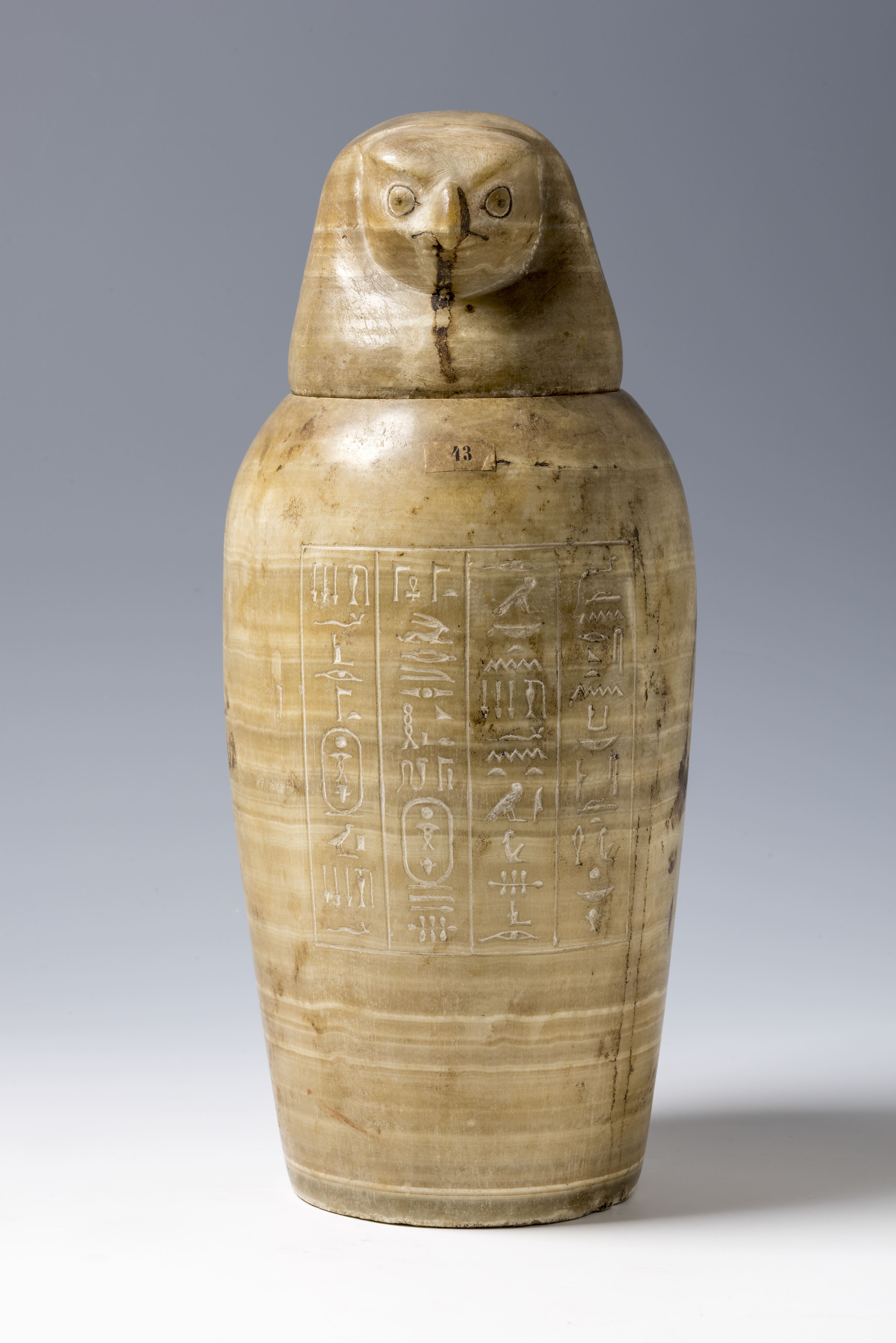 Sul corpo di ciascun vaso si trova in genere un’iscrizione in colonne che riporta il nome del dio associato a quello di una divinità femminile corrispondente, oltre al nome e alla titolatura del defunto che, nel caso di questi raffinati esemplari in Alabastro del Museo torinese, era il dignitario Wah-ib-Ra.