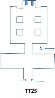 L’accesso alla TT25 si apre in una corte; attraverso un corridoio, sulle cui pareti il defunto e la moglie adorano Ra-Horakhti e Maat, nonché Osiride e Iside, si accede ad un corridoio trasversale, come è solito in tombe di questo periodo, i cui dipinti parietali rappresentano il defunto presentato ad Anubi e alla dea dell’Occidente (Hathor) da Thot e Horus; in altre scene, il defunto e la moglie, Tausert, in offertorio dinanzi a Ra-Horakhti; la mummia di Amenemheb dinanzi ad Hathor in forma di vacca sacra; brani del Libro delle Porte e scene di offertorio a divinità varie. Analoghe scene di offertorio a divinità non identificabili nel corridoio che dà accesso ad una camera quasi quadrata con soffitto sorretto da quattro pilastri, priva di decorazioni.