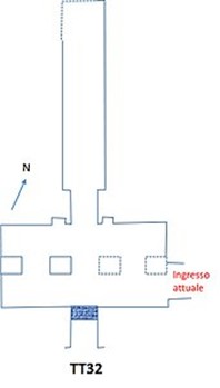 La TT32 si sviluppa con la forma Tipica delle sepolture di questo periodo, a “T” rovesciata, con un corridoio trasversale subito dopo l’ingresso; l’accesso originario tuttavia, che si apriva su uno dei lati lunghi del corridoio trasversale, è oggi sostituito da un ingresso laterale. Il corridoio trasversale, che funge di fatto da anticamera, presenta quattro pilastri, di cui due ormai demoliti; su più registri il Libro delle Porte nonché scene di offertorio del defunto e della moglie dinanzi al dio Nefertrum. In un’altra scena, Thutmose e la moglie Esi sono presentati a Osiride e Iside dal dio Anubi. Due nicchie, che precedono un lungo corridoio ortogonale a quello trasversale, contengono statue sovrastate dal dio Anubi in forma di sciacallo. Sui pilastri superstiti, il defunto in presenza di Hathor, Thot e Atum.