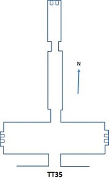 TT35 si sviluppa, come altre tombe del medesimo periodo, in forma di “T” capovolta. Ad un breve corridoio, in cui il dipinto parietale rappresenta il defunto e la moglie in offertorio mentre una scimmia si nasconde sotto la sedia di Meretseger e due uccelli “ba” sono posati su uno scrigno, segue un corridoio trasversale alle cui estremità si trovano statue del defunto e di sua moglie, da un lato in atto di ricevere offerte e nell’altro nell’atto di offrirle a loro volta alla dea Hathor, Signora dell’Occidente. Un secondo corridoio dà accesso ad una lunga sala, in cui sono rappresentate liste di offerte e scene liturgiche, che termina in una nuova lunga camera al cui fondo si trovano due statue assise non iscritte.