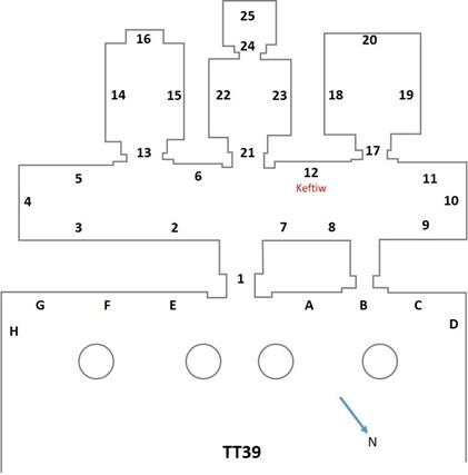 Due brevi corridoi danno accesso ad un corridoio trasversale. Sulle pareti di uno dei due (1 in planimetria) è rappresentato il defunto; i corridoi danno accesso ad una sala trasversale con dipinti parietali che concernono, principalmente, aspetti della vita di ogni giorno: il defunto con suoi collaboratori (2) e resti di testo; su sei registri sovrapposti (3) un giardino, quanto resta di portatori di prodotti e bestiame, il defunto che ispeziona lavoratori del tempio di Amon, tra cui costruttori di archi e carri, orafi, carpentieri, gioiellieri, vasai, nonchè lavoratori agricoli intenti all’aratura.