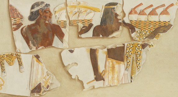 La colorazione della pelle è rosso scuro[9], la postura e la dimensione del personaggio ricalcano quelle degli altri dignitari e la capigliatura è ripartita in sottili trecce che richiamano quelle del dipinto, noto come “Principe dei gigli” del Palazzo reale di Cnosso. La particolarità della scena sta nel fatto che non è assolutamente esplicito il fatto che siano i quattro a consegnare il quantitativo d’oro, ma sembra più realistico supporre, stando alle posture dei dignitari (in qualche modo di attesa e non attive), che siano semplicemente presenti alla pesatura ed alla presentazione del prezioso materiale[10] quasi si trattasse di ambasciatori o comunque rappresentanti delle terre di provenienza. Tale scena, così come quelle analoghe presenti in altre tombe della Necropoli tebana sarebbero sintomatiche di rapporti amichevoli, e non di sudditanza, tra l’Egitto e le popolazioni egee nel periodo del Bronzo tardo.