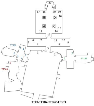 [6] Giacché dal cortile si accede a quattro distinte tombe, i riferimenti sono stati riportati in differente colore; quelli relativi alla TT49 sono di colore nero.