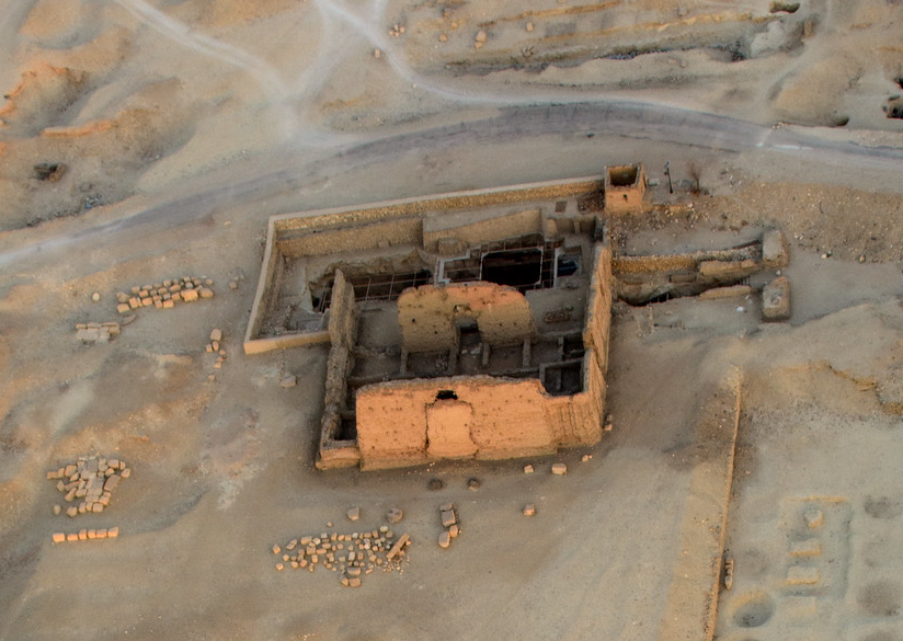 Poco discosta dal muro di recinzione, nel’angolo sud-ovest, si erge quanto resta di una piramide in mattoni crudi (E) mentre di una seconda piramide si ha solo menzione in atti risalenti agli anni ’30 del ‘900 [7] [8].