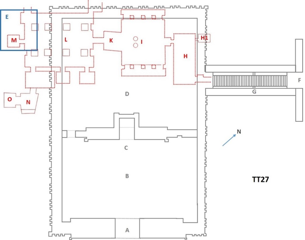 La tomba[5] era inaccessibile[6]. Solo negli anni ’90 del ‘900 si è proceduto allo svuotamento e alla rilevazione epigrafica di TT27 a cura di una missione italiana. La sovrastruttura della tomba è costituita da un recinto con muro a “facciata di palazzo”, con rientranze e sporgenze, che presenta un pilone di accesso (A in planimetria) cui segue un cortile (B) chiuso da un muro (C) da cui, attraverso un breve corridoio, si accede ad un secondo cortile (D) in cui si apre un “pozzo di luce” che affaccia su un cortile con portici (I) della parte sotterranea della tomba.