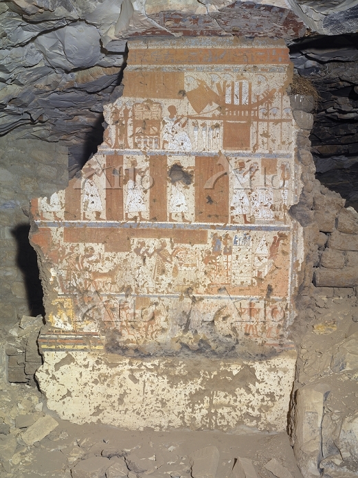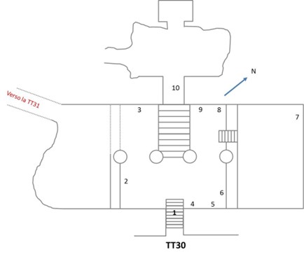 Dalla scala di accesso, sulle cui pareti (1 in planimetria) i resti di alcuni testi e immagini del defunto dinanzi a un dio (?), si accede all’anticamera colonnata; su più registri (2) il Libro delle Porte, nonché rappresentazioni della processione funeraria e del defunto in ginocchio dinanzi ad una barca sacra. Preti operano sulla mummia la cerimonia di apertura della bocca.